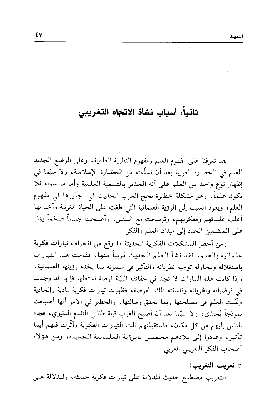 ومن أخطر المشكلات الفكرية الحديثة ما وقع من انحراف تيارات فكرية علمانية بالعلم، فقد نشأ العلم الحديث قريبًا منها، فقامت هذه التيارات باستغلاله ومحاولة توجيه نظرياته والتأثير في مسيرته بما يخدم رؤيتها العلمانية. وإذا كانت هذه التيارات لا تجد في حقائقه البيّنة فرصة تستغلها فإنها قد وجدت في فرضياته ونظرياته وفلسفته تلك الفرصة، فظهرت تيارات فكرية مادية وإلحادية وظّفت العلم في مصلحتها وبما يحقق رسالتها. والخطير في الأمر أنها أصبحت نموذجًا يُحتذى، ولاسيّما بعد أن أصبح الغرب قبلة طالبي التقدم الدنيوي، فجاء الناس إليهم من كل مكان، فاستقبلتهم تلك التيارات الفكرية وأثّرت فيهم أيّما تأثير، وعادوا إلى بلادهم محملين بالرؤية العلمانية الجديدة، ومن هؤلاء أصحاب الفكر التغريبي العربي.
