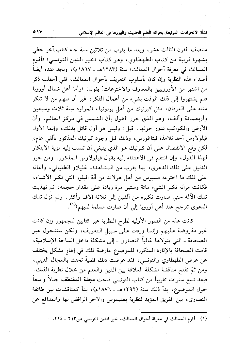منتصف القرن الثالث عشر، وبعد ما يقرب من ثلاثين سنة جاء كتاب آخر حظي بشهرة قريبة من كتاب الطهطاوي، وهو كتاب "خير الدين التونسي" "أقوم المسالك في معرفة أحوال الممالك" سنة (1283 هـ-1867 م)، ونجد عنده أيضًا أصداء هذه النظرية وإن كان بأسلوب التعريف بأحوال الممالك، ففي [مطلب ذكر من اشتهر من الأوروبيين بالمعارف والاختراعات]، يقول: "وأما أهل شمال أوروبا فلم يشتهروا إلى ذلك الوقت بشيء من أعمال الفكر، غير أن منهم من لا تنكر منته على العرفان، مثل كبرنيك من أهل بولونيا، المولود سنة ثلاث وسبعين وأربعمائة وألف، وهو الذي حرر القول بأن الشمس في مركز العالم، وأن الأرض والكواكب تدور حولها. قيل: وليس هو أول قائل بذلك، وإنما الأول فيلولاوس أحد تلامذة فيثاغورس، وذلك قبل وجود كبرنيك المذكور بألفي عام، لكن وقع الانفصال على أن كبرنيك هو الذي ينبغي أن تنسب إليه مزية الابتكار لهذا القول، وإن انتفع في الاهتداء إليه بقول فيلولاوس المذكور. ومن حرر الدليل على تلك الدعوى، بما يقرب من المشاهدة، غليلاو الطلياني، وأعانه على ذلك ما اخترعه مسيوس من أهل هولاند من آلة البلور التي تكبر الأشياء، فكانت مرآته تكبر الشيء مائة وستين مرة زيادة على مقدار حجمه، ثم تهذبت تلك الآلة حتى صارت تكبره من ألفين إلى ثلاثة آلاف وأكثر. ولم تزل تلك الدعوى تترجح عند أهل أوروبا إلى أن صارت مسلمة لديهم" (¬1).