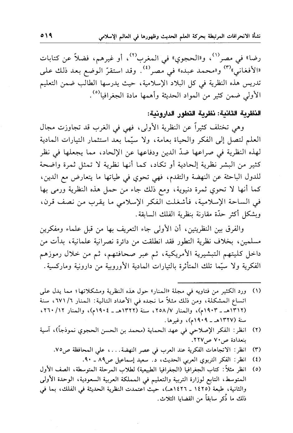 رضا" في مصر (¬1)، و"الحجوي" في المغرب (¬2)، أو غيرهم، فضلًا عن كتابات "الأفغاني" (¬3) و"محمد عبده" في مصر (¬4). وقد استقرّ الوضع بعد ذلك على تدريس هذه النظرية في كل البلاد الإسلامية، حيث يدرسها الطالب ضمن التعليم الأولي ضمن كثير من المواد الحديثة وأهمها مادة الجغرافيا (¬5).