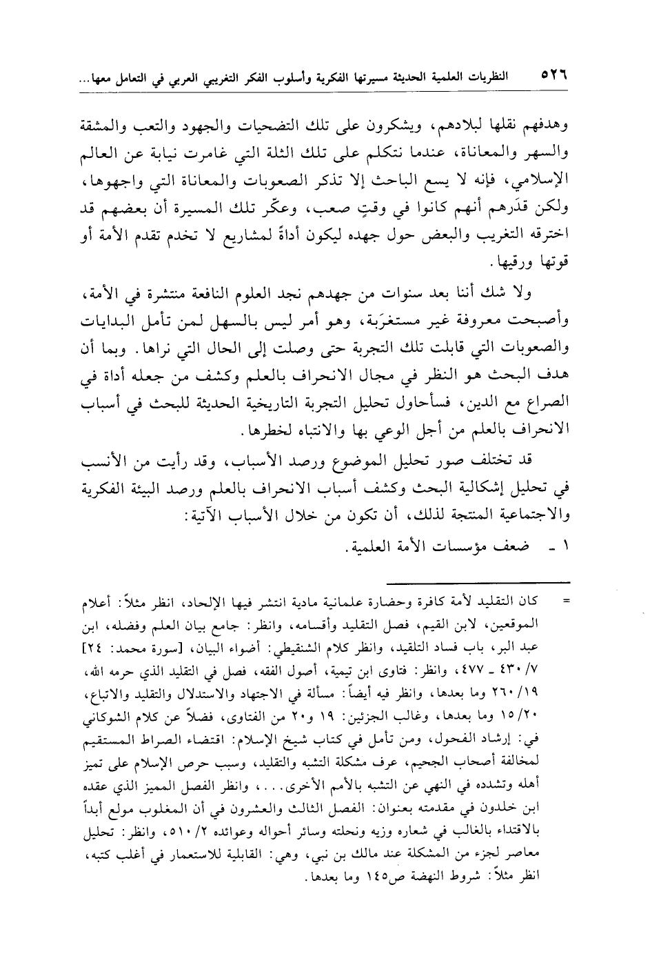 = كان التقليد لأمة كافرة وحضارة علمانية مادية انتشر فيها الإلحاد، انظر مثلًا: أعلام الموقعين، لابن القيم، فصل التقليد وأقسامه، وانظر: جامع بيان العلم وفضله، ابن عبد البر، باب فساد التلقيد، وانظر كلام الشنقيطي: أضواء البيان، [سورة محمد: 24] 7/ 430 - 477، وانظر: فتاوى ابن تيمية، أصول الفقه، فصل في التقليد الذي حرمه الله، 19/ 260 وما بعدها، وانظر فيه أيضًا: مسألة في الاجتهاد والاستدلال والتقليد والاتباع، 20/ 15 وما بعدها، وغالب الجزئين: 19 و 20 من الفتاوى، فضلًا عن كلام الشوكاني في: إرشاد الفحول، ومن تأمل في كتاب شيخ الإسلام: اقتضاء الصراط المستقيم لمخالفة أصحاب الجحيم، عرف مشكلة التشبه والتقليد، وسبب حرص الإسلام على تميز أهله وتشدده في النهي عن التشبه بالأمم الأخرى. . . .، وانظر الفصل المميز الذي عقده ابن خلدون في مقدمته بعنوان: الفصل الثالث والعشرون في أن المغلوب مولع أبدًا بالاقتداء بالغالب في شعاره وزيه ونحلته وسائر أحواله وعوائده 2/ 510، وانظر: تحليل معاصر لجزء من المشكلة عند مالك بن نبي، وهي: القابلية للاستعمار في أغلب كتبه، انظر مثلًا: شروط النهضة ص 145 وما بعدها.