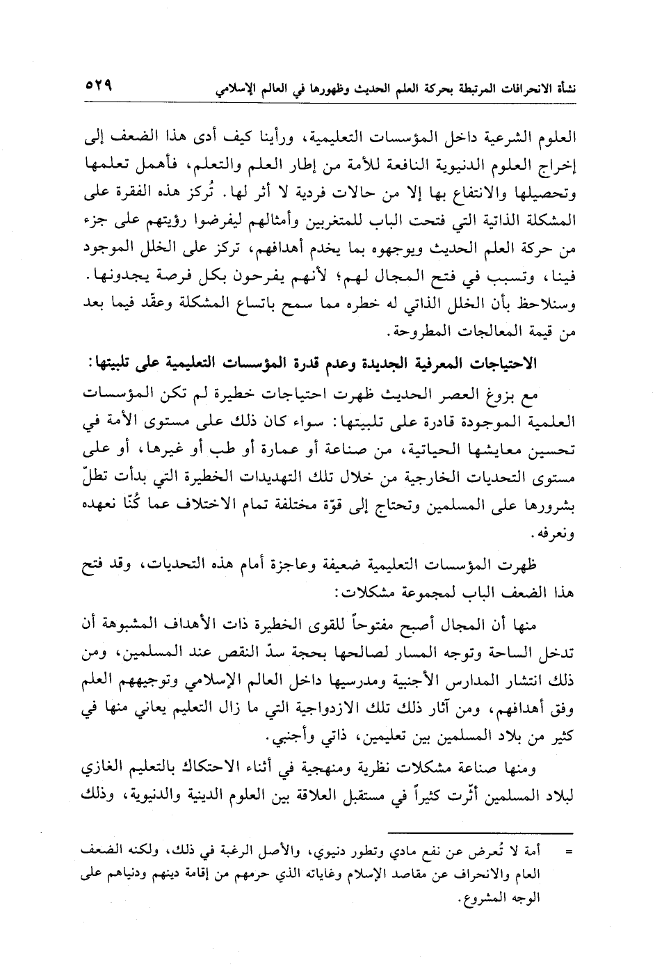 العلوم الشرعية داخل المؤسسات التعليمية، ورأينا كيف أدى هذا الضعف إلى إخراج العلوم الدنيوية النافعة للأمة من إطار العلم والتعلم، فأهمل تعلمها وتحصيلها والانتفاع بها إلا من حالات فردية لا أثر لها. تُركز هذه الفقرة على المشكلة الذاتية التي فتحت الباب للمتغربين وأمثالهم ليفرضوا رؤيتهم على جزء من حركة العلم الحديث ويوجهوه بما يخدم أهدافهم، تركز على الخلل الموجود فينا، وتسبب في فتح المجال لهم؛ لأنهم يفرحون بكل فرصة يجدونها. وسنلاحظ بأن الخلل الذاتي له خطره مما سمح باتساع المشكلة وعقّد فيما بعد من قيمة المعالجات المطروحة.