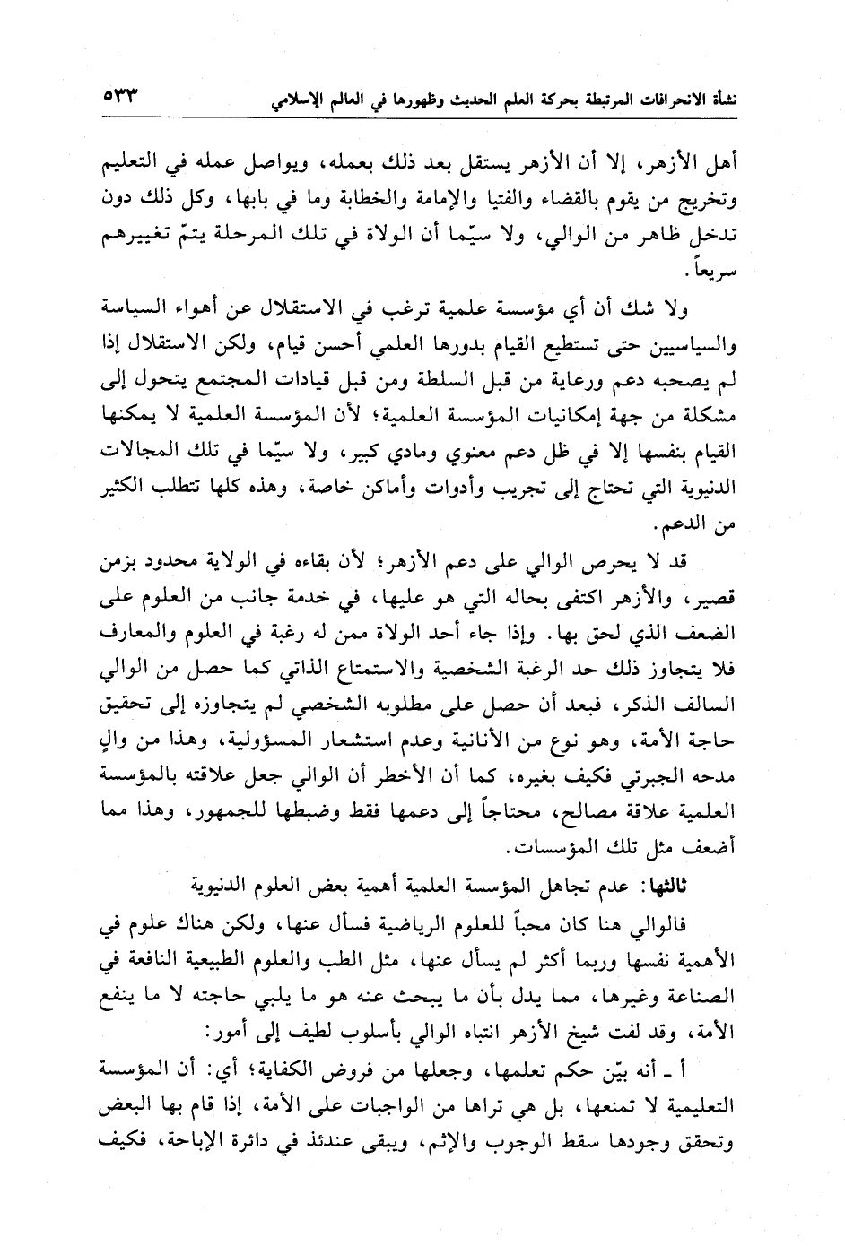 ثالثها: عدم تجاهل المؤسسة العلمية أهمية بعض العلوم الدنيوية فالوالي هنا كان محبًا للعلوم الرياضية فسأل عنها, ولكن هناك علوم في الأهمية نفسها وربما أكثر لم يسأل عنها، مثل الطب والعلوم الطبيعية النافعة في الصناعة وغيرها، مما يدل بأن ما يبحث عنه هو ما يلبي حاجته لا ما ينفع الأمة، وقد لفت شيخ الأزهر انتباه الوالي بأسلوب لطيف إلى أمور: