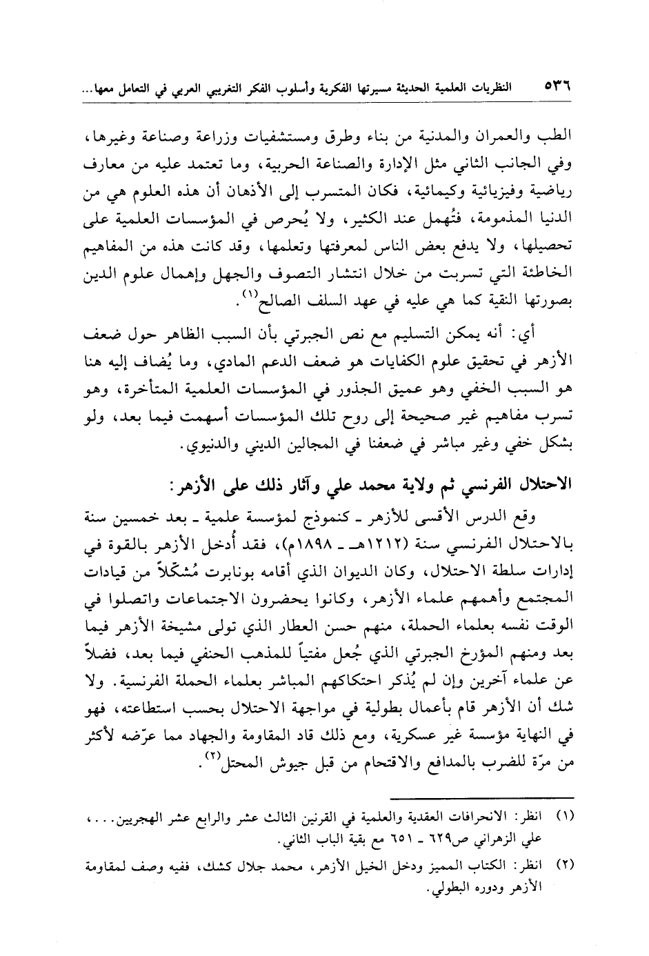 أي: أنه يمكن التسليم مع نص الجبرتي بأن السبب الظاهر حول ضعف الأزهر في تحقيق علوم الكفايات هو ضعف الدعم المادي، وما يُضاف إليه هنا هو السبب الخفي وهو عميق الجذور في المؤسسات العلمية المتأخرة، وهو تسرب مفاهيم غير صحيحة إلى روح تلك المؤسسات أسهمت فيما بعد، ولو بشكل خفي وغير مباشر في ضعفنا في المجالين الديني والدنيوي.