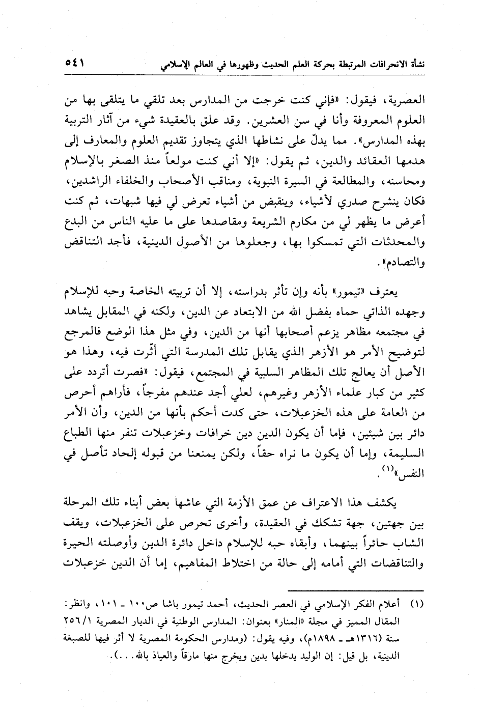 (¬1) أعلام الفكر الإِسلامي في العصر الحديث، أحمد تيمور باشا ص 100 - 101، وانظر: المقال المميز في مجلة "المنار" بعنوان: المدارس الوطنية في الديار المصرية 1/ 256 سنة (1316 هـ -1898 م)، وفيه يقول: (ومدارس الحكومة المصرية لا أثر فيها للصبغة الدينية، بل قيل: إن الوليد يدخلها بدين ويخرج منها مارقًا والعياذ بالله. . . .).