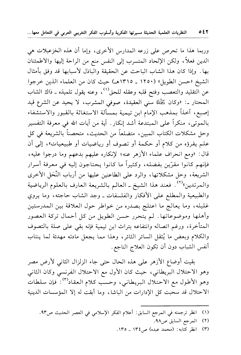 وربما هذا ما تحرص على زرعه المدارس الأخرى، وإما أن هذه الخزعبلات هي الدين فعلًا، ولكن الإلحاد المتسرب إلى النفس منع من الراحة إليها والاطمئنان بها. وإذا كان هذا الشاب الباحث عن الحقيقة والباذل لأسبابها قد وفق بأمثال الشيخ "حسن الطويل" (1250 - 1315 هـ) حيث كان من العلماء الذين خرجوا عن التقليد والتعصب وفتح قلبه وعقله للحق (¬1)، وعنه يقول تلميذه -ذاك الشاب المحتار-: "وكان -رحمه الله- سني العقيدة، صوفي المشرب، لا يحيد عن الشرع قيد إصبع، آخذًا بمذهب الإِمام ابن تيمية بمسألة الاستغاثة بالقبور والاستشفاء بالموتى، منكرًا على المبتدعة أشد إنكار. آية من آيات الله في معرفة التفسير وحل مشكلات الكتاب المبين، متضلعًا من الحديث، متحصنًا بالشريعة في كل علم يقرؤه من كلام أو حكمة أو تصوف أو رياضيات أو طبيعيات"، إلى أن قال: "ومع انحراف علماء الأزهر عنه؛ لإنكاره عليهم بدعهم وما درجوا عليه، فإنهم كانوا مقرّين بفضله، وكثيرًا ما كانوا يحتاجون إليه في معرفة أسرار الشريعة، وحل مشكلاتها، والرد على الطاعنين عليها من أرباب النِّحَل الأخرى والمرتدين" (¬2). فعند هذا الشيخ -العالم بالشريعة العارف بالعلوم الرياضية والطبيعية والمطلع على الأفكار والفلسفات- وجد الشاب حاجته، وما يروي غليله، وما يعالج ما اعتلج بصدره من خواطر حول العلاقة بين المدرستين وأهلها وموضوعاتها. لم يتحرر حسن الطويل من كل أحمال تركة العصور المتأخرة، ورغم اتصاله وانتفاعه بتراث ابن تيمية فإنه بقي على صلة بالتصوف والكلام وبعض ما يُثقل السائر الثائر، وهذا مما يجعل مادته مهدئة لما ينتاب أنفس الشباب دون أن تكون العلاج الناجع.
