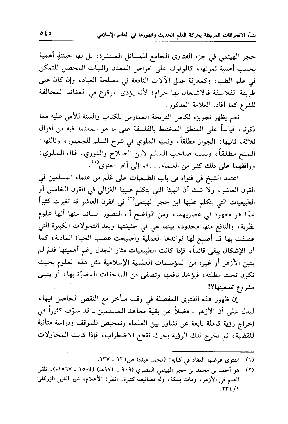 اعتمد الشيخ في فتواه في باب الطبيعيات على عَلَم من علماء المسلمين في القرن العاشر، ولا شك أن الهيئة التي يتكلم عليها الغزالي في القرن الخامس أو الطبيعيات التي يتكلم عليها ابن حجر الهيتمي (¬2) في القرن العاشر قد تغيرت كثيرًا عمّا هو معهود في عصريهما، ومن الواضح أن التصور السائد عنها أنها علوم نظرية، والنافع منها محدود، بينما هي في حقيقتها وبعد التحولات الكبيرة التي عصفت بها قد أصبح لها فوائدها العملية وأصبحت عصب الحياة المادية، كما أن الإشكال يبقى قائمًا، فإذا كانت الطبيعيات مثار الجدل رغم أهميتها فلِمَ لم يتبن الأزهر أو غيره من المؤسسات العلمية الإِسلامية مثل هذه العلوم بحيث تكون تحت مظلته، فيؤخذ نافعها وتصفى من الملحقات المضرّة بها، أو يتبنى مشروع تصفيتها؟!