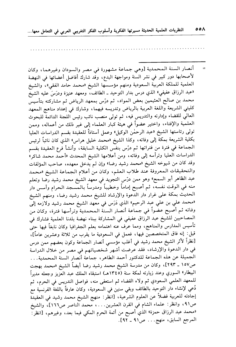 = أنصار السنة المحمدية [وهي جماعة مشهورة في مصر والسودان وغيرهما، وكان لأصحابها دور كبير في نشر السنة ومواجهة البدع، وقد شارك أفاضل أعضائها في النهضة العلمية للملكة العربية السعودية ومنهم مؤسسها الشيخ "محمد حامد الفقي"، والشيخ "عبد الرزاق عفيفي" الذي درس بدار التوحيد -الطائف، ومعهد عنيزة ودرَسَ عليه الشيخ محمد بن صالح العثيمين بعض المواد، ثم درّس بمعهد الرياض ثم مشاركته بتأسيس كليتي الشريعة واللغة العربية بالرياض وتدريسه فيهما، وشارك في إعداد مناهج المعهد العالي للقضاء وإدارته والتدريس فيه، ثم تولى منصب نائب رئيس اللجنة الدائمة للبحوث العلمية والإفتاء، واختير عضوًا في هيئة كبار العلماء إلى غير ذلك من أعماله، وممن تولى رئاستها الشيخ "عبد الرحمن الوكيل" وعمل أستاذًا للعقيدة بقسم الدراسات العليا بكلية الشريعة بمكة إلى وفاته، وكذا الشيخ "محمد خليل هراس" الذي كان نائبًا لرئيس الجماعة في فترة من فتراتها ثم درّس بنفس الكلية السابقة، وأنشأ فرع العقيدة بقسم الدراسات العليا وترأسه إلى وفاته، ومن أعلامها الشيخ المحدث "أحمد محمد شاكر" وقد كان من شيوخه الشيخ "محمد رشيد رضا" وإن لم يدخل معهده، صاحب المؤلفات والتحقيقات المعروفة عند طلاب العلم، وكان من أعلام الجماعة الشيخ "محمد عبد الظاهر أبو السمح" وهو ممن درّس التجويد في معهد الشيخ محمد رشيد رضا وتعلم منه في الوقت نفسه، ثم أصبح إمامًا وخطيبًا ومدرسًا بالمسجد الحرام وأسس دار الحديث بمكة على غرار دار الدعوة والإرشاد للشيخ محمد رشيد رضا، ومنهم الشيخ "محمد علي بن علي عبد الرحيم" الذي دَرَس في معهد الشيخ محمد رشيد ولازمه إلى وفاته ثم أصبح عضوًا في جماعة أنصار السنة المحمدية وترأسها فترة، وكان من المصاحبين للشيخ عبد الرزاق عفيفي في المشاركة ببناء نهضة بلدنا العلمية فشارك في تأسيس المدارس والمناهج، ومما عرف عنه اهتمامه بعلم الجغرافيا وكان نابغًا فيها حتى قيل: إنه فاق المتخصصين فيها، فعمل في السعودية ما يقرب من ثلاثة وعشرين عامًا]، [نظرًا لأثر الشيخ محمد رشيد في أغلب مؤسسي أنصار الجماعة وكون بعضهم ممن درس في دار الدعوة والإرشاد، فقد عرضت أشهر شخصياتهم في مصر من خلال الدراسة الجميلة عن هذه الجماعة للدكتور أحمد الطاهر، جماعة أنصار السنة المحمدية. . . . ص 157 - 293]، وكان من مدرسة الشيخ محمد رشيد رضا أيضًا الشيخ "محمد بهجت البيطار" السوري وعند زيارته لمكة سنة (1345 هـ) استبقاه الملك عبد العزيز وجعله مديرًا للمعهد العلمي السعودي ثم ولاه القضاء ثم استعفى منه، فواصل التدريس في الحرم، ثم دُعي لإنشاء دار التوحيد بالطائف وبقي سنين في السعودية، وكان عارفًا باللغة الفرنسية مع إجادته للعربية فضلًا عن العلوم الشرعية، [انظر: منهج الشيخ محمد رشيد في العقيدة ص 91، وانظر: علماء الشام في القرن العشرين. . . .، محمد الناصر ص 166]، والشيخ "محمد عبد الرزاق حمزة" الذي أصبح من أئمة الحرم المكي فيما بعد، وغيرهم، [انظر: المرجع السابق، منهج. . . . ص 91 - 92].