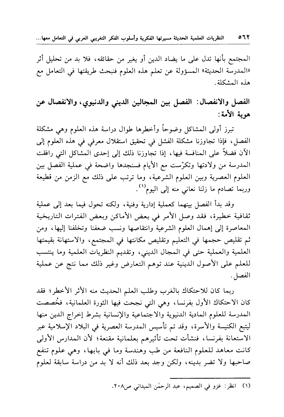 المجتمع بأنها تدل على ما يضاد الدين أو يغير من حقائقه، فلابد من تحليل أثر "المدرسة الحديثة" المسؤولة عن تعلم هذه العلوم فنبحث طريقتها في التعامل مع هذه المشكلة.
