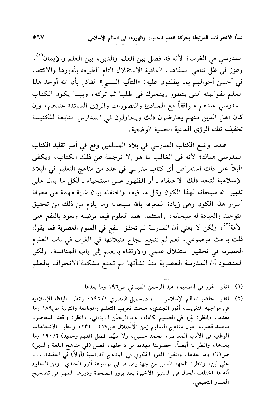 عندما وضع الكتاب المدرسي في بلاد المسلمين وقع في أسر تقليد الكتاب المدرسي هناك؛ لأنه في الغالب ما هو إلا ترجمة عن ذلك الكتاب، ويكفي دليلًا على ذلك استعراض أي كتاب مدرسي في عدد من مناهج التعليم في البلاد الإسلامية لتجد ذلك الاختفاء -أو الظهور على استحياء- لكل ما يدل على تدبير الله سبحانه لهذا الكون وكل ما فيه، واختفاء بيان غاية مهمة من معرفة أسرار هذا الكون وهي زيادة المعرفة بالله سبحانه وما يلزم من ذلك من تحقيق التوحيد والعبادة له سبحانه، واستثمار هذه العلوم فيما يرضيه ويعود بالنفع على الأمة (¬2)، ولكن لا يعني أن المدرسة لم تحقق النفع في العلوم العصرية فما يقول ذلك باحث موضوعي، نعم لم تنجح نجاح مثيلاتها في الغرب في باب العلوم العصرية في تحقيق استقلال علمي والارتقاء بالعلم إلى باب المنافسة، ولكن المقصود أن المدرسة العصرية منذ نشأتها لم تمنع مشكلة الانحراف بالعلم