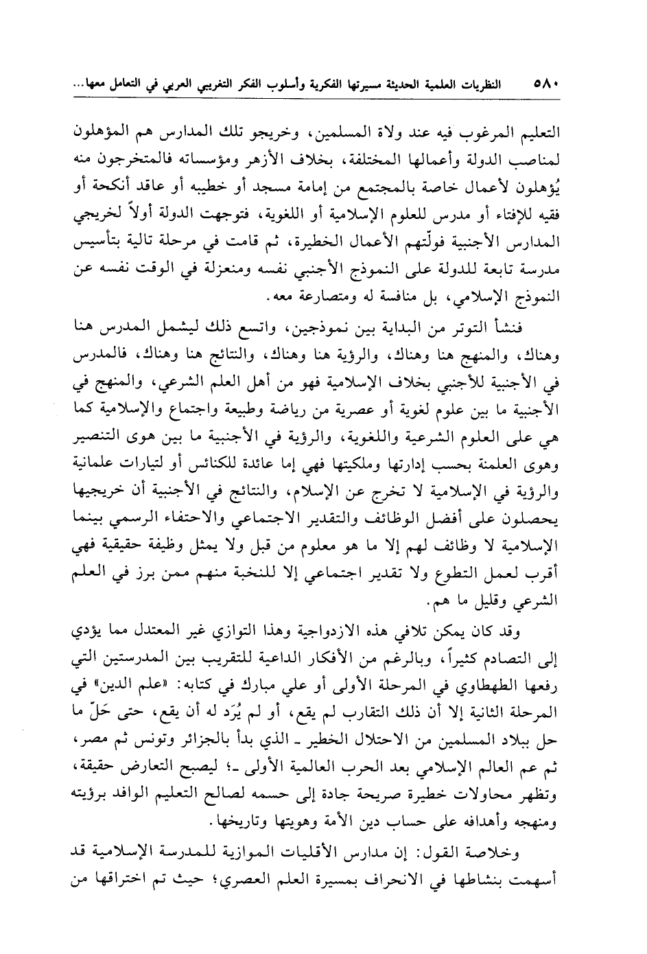 وقد كان يمكن تلافي هذه الازدواجية وهذا التوازي غير المعتدل مما يؤدي إلى التصادم كثيرًا، وبالرغم من الأفكار الداعية للتقريب بين المدرستين التي رفعها الطهطاوي في المرحلة الأولى أو علي مبارك في كتابه: "علم الدين" في المرحلة الثانية إلا أن ذلك التقارب لم يقع، أو لم يُرَد له أن يقع، حتى حَلّ ما حل ببلاد المسلمين من الاحتلال الخطير -الذي بدأ بالجزائر وتونس ثم مصر، ثم عم العالم الإسلامي بعد الحرب العالمية الأولى-؛ ليصبح التعارض حقيقة، وتظهر محاولات خطيرة صريحة جادة إلى حسمه لصالح التعليم الوافد برؤيته ومنهجه وأهدافه على حساب دين الأمة وهويتها وتاريخها.