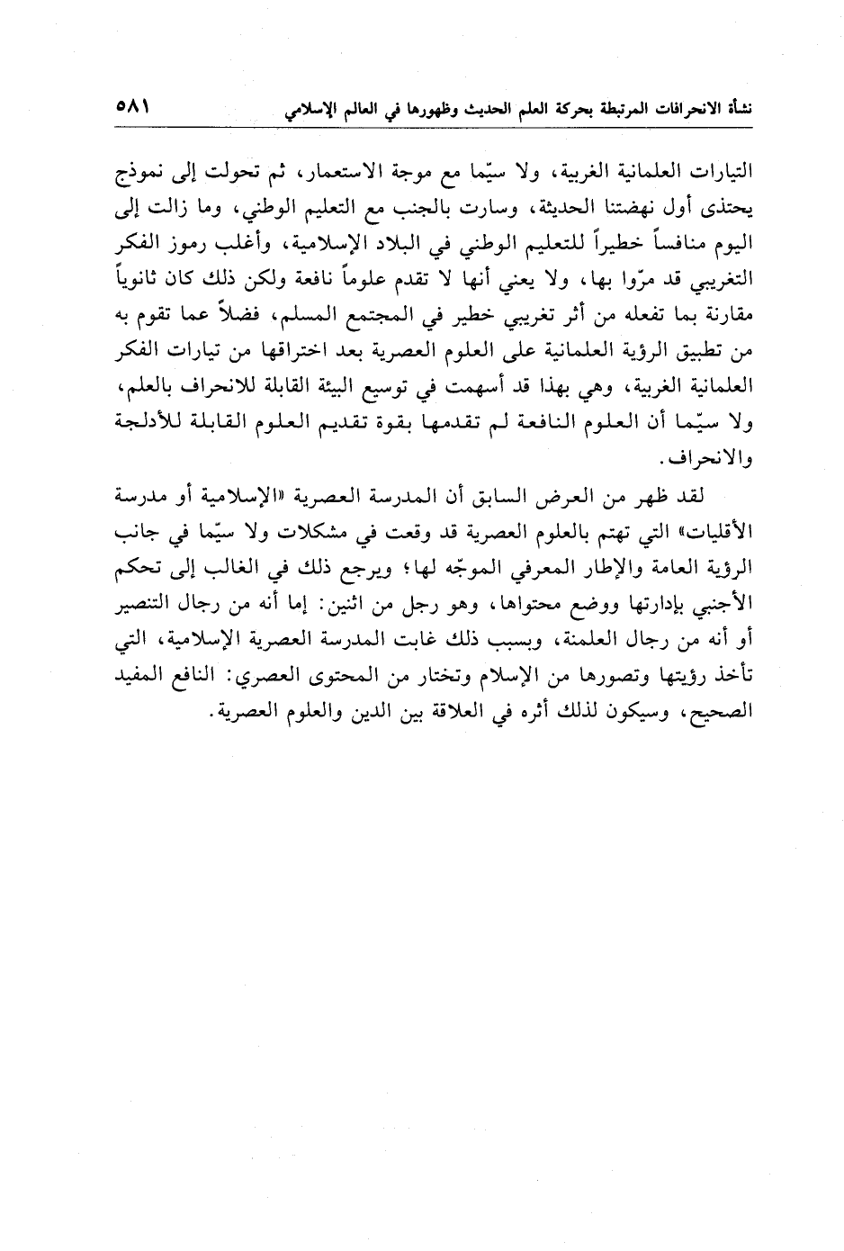 التيارات العلمانية الغربية، ولاسيّما مع موجة الاستعمار، ثم تحولت إلى نموذج يحتذى أول نهضتنا الحديثة، وسارت بالجنب مع التعليم الوطني، وما زالت إلى اليوم منافسًا خطيرًا للتعليم الوطني في البلاد الإسلامية، وأغلب رموز الفكر التغريبي قد مرّوا بها، ولا يعني أنها لا تقدم علومًا نافعة ولكن ذلك كان ثانويًا مقارنة بما تفعله من أثر تغريبي خطير في المجتمع المسلم، فضلًا عما تقوم به من تطبيق الرؤية العلمانية على العلوم العصرية بعد اختراقها من تيارات الفكر العلمانية الغربية، وهي بهذا قد أسهمت في توسيع البيئة القابلة للانحراف بالعلم، ولاسيّما أن العلوم النافعة لم تقدمها بقوة تقديم العلوم القابلة للأدلجة والانحراف.