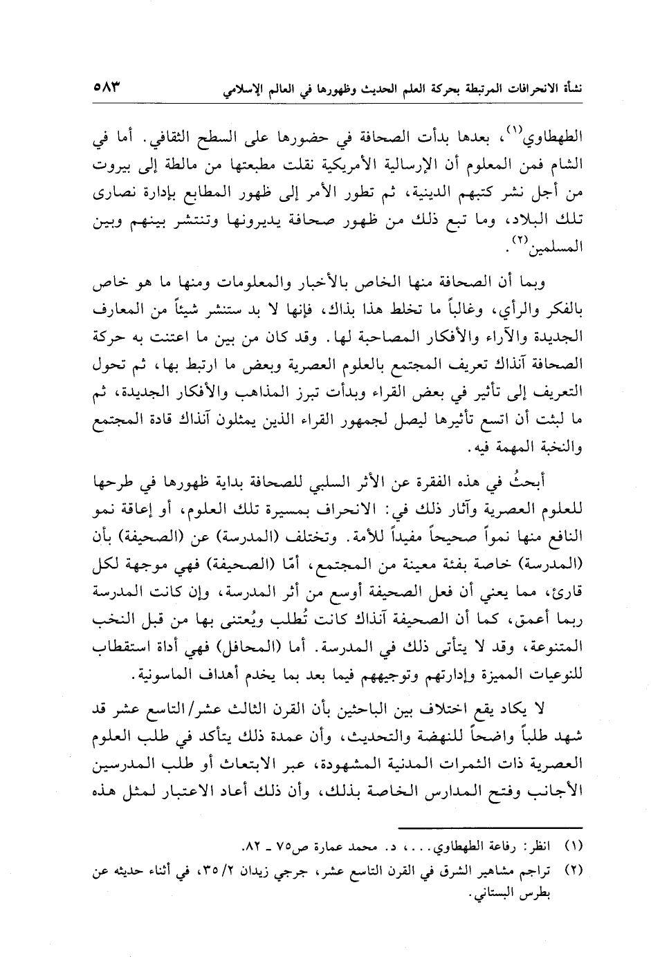 أبحثُ في هذه الفقرة عن الأثر السلبي للصحافة بداية ظهورها في طرحها للعلوم العصرية وآثار ذلك في: الانحراف بمسيرة تلك العلوم، أو إعاقة نمو النافع منها نموًا صحيحًا مفيدًا للأمة. وتختلف (المدرسة) عن (الصحيفة) بأن (المدرسة) خاصة بفئة معينة من المجتمع، أمّا (الصحيفة) فهي موجهة لكل قارئ، مما يعني أن فعل الصحيفة أوسع من أثر المدرسة، وإن كانت المدرسة ربما أعمق، كما أن الصحيفة آنذاك كانت تُطلب ويُعتنى بها من قبل النخب المتنوعة، وقد لا يتأتى ذلك في المدرسة. أما (المحافل) فهي أداة استقطاب للنوعيات المميزة وإدارتهم وتوجيههم فيما بعد بما يخدم أهداف الماسونية.