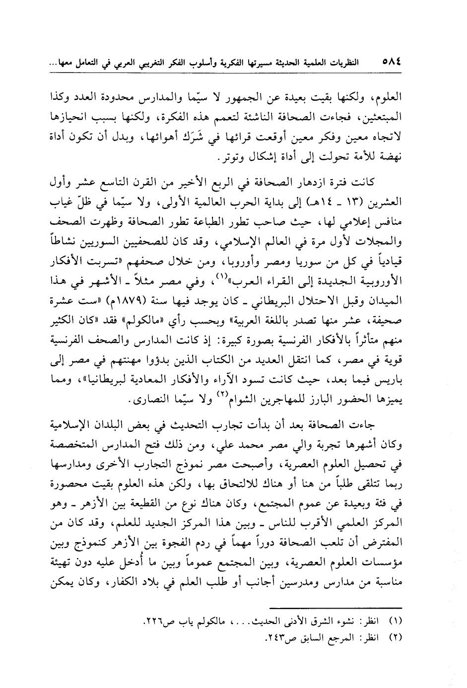 العلوم، ولكنها بقيت بعيدة عن الجمهور لاسيّما والمدارس محدودة العدد وكذا المبتعثين، فجاءت الصحافة الناشئة لتعمم هذه الفكرة، ولكنها بسبب انحيازها لاتجاه معين وفكر معين أوقعت قرائها في شَرَك أهوائها، وبدل أن تكون أداة نهضة للأمة تحولت إلى أداة إشكال وتوتر.