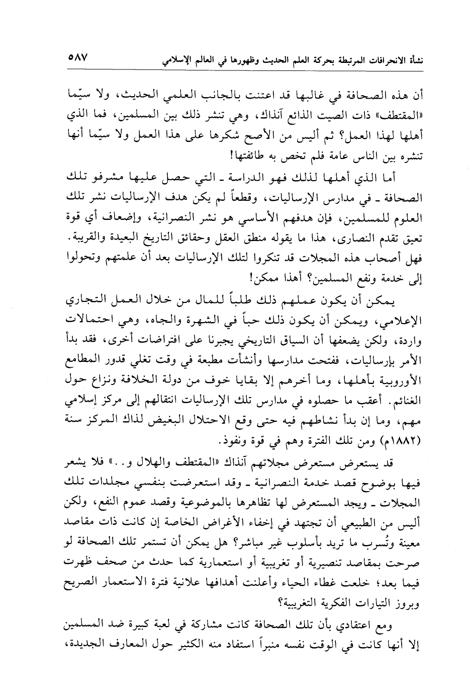 أن هذه الصحافة في غالبها قد اعتنت بالجانب العلمي الحديث، ولاسيّما "المقتطف" ذات الصيت الذائع آنذاك، وهي تنشر ذلك بين المسلمين، فما الذي أهلها لهذا العمل؟ ثم أليس من الأصح شكرها على هذا العمل ولاسيّما أنها تنشره بين الناس عامة فلم تخص به طائفتها!
