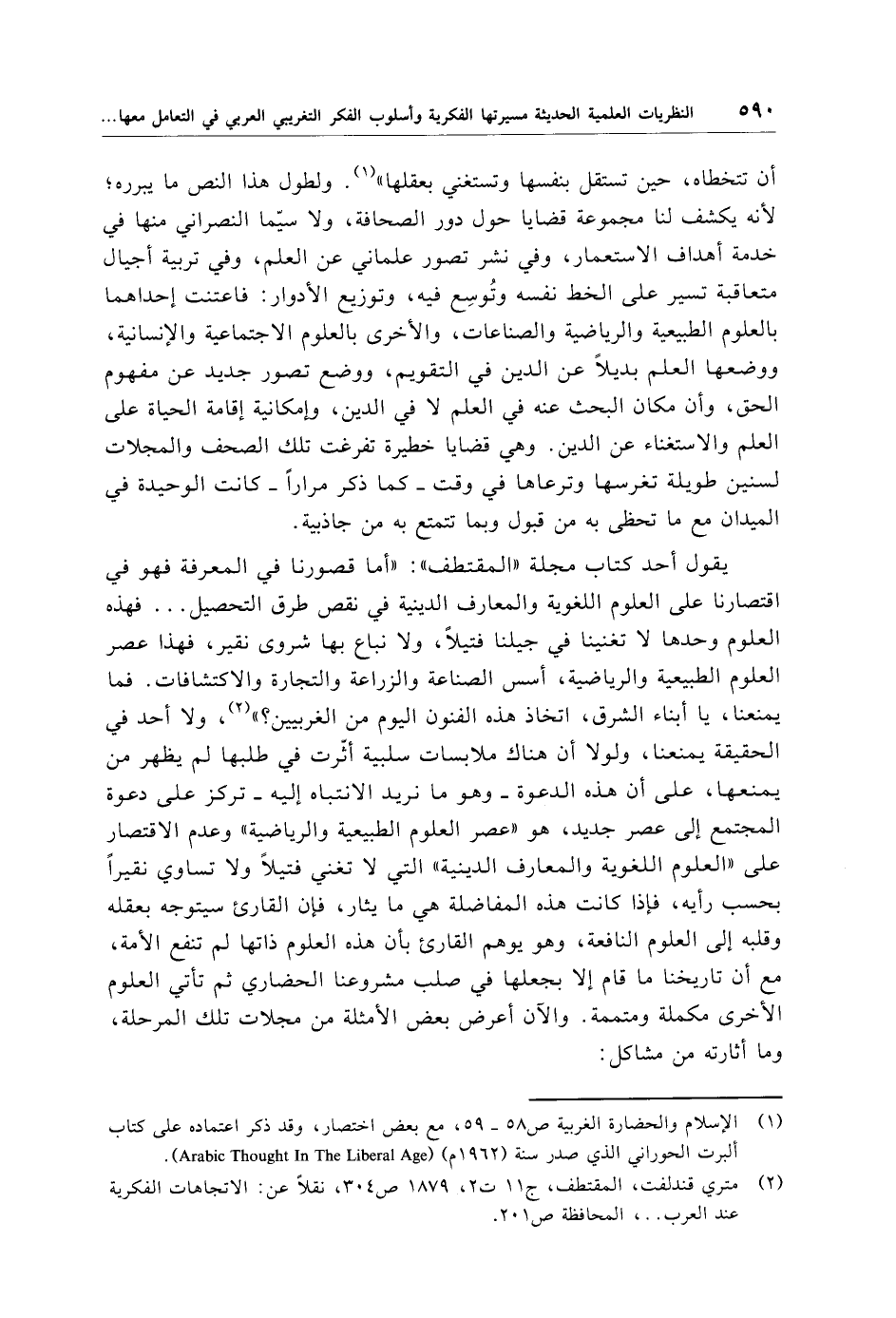 (¬1) الإسلام والحضارة الغربية ص 58 - 59، مع بعض اختصار، وقد ذكر اعتماده على كتاب ألبرت الحوراني الذي صدر سنة (1962 م) (Arabic Thought In The Liberal Age).