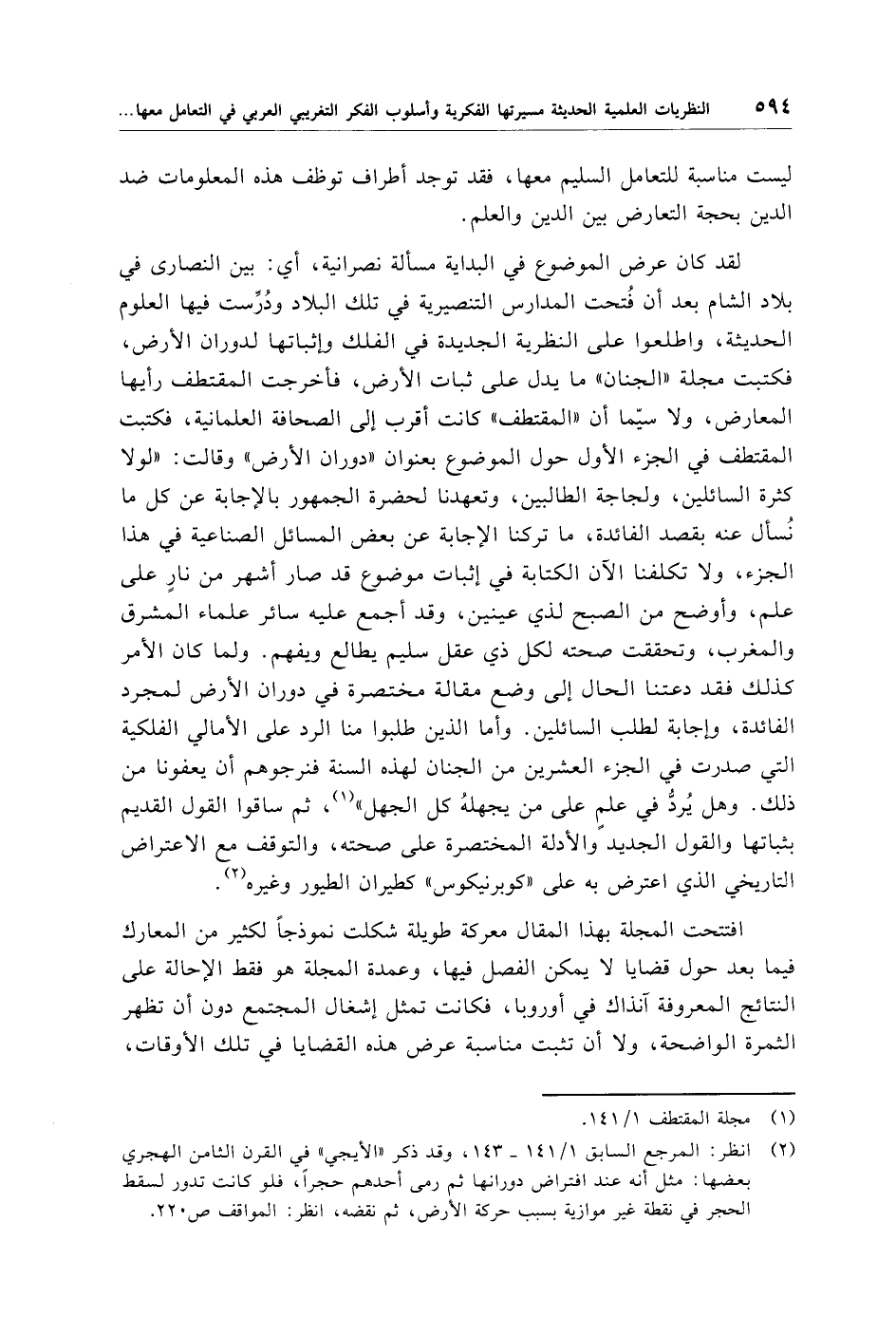 (¬2) انظر: المرجع السابق 1/ 141 - 143، وقد ذكر "الأيجي" في القرن الثامن الهجري بعضها: مثل أنه عند افتراض دورانها ثم رمى أحدهم حجرًا، فلو كانت تدور لسقط الحجر في نقطة غير موازية بسبب حركة الأرض، ثم نقضه، انظر: المواقف ص 220.