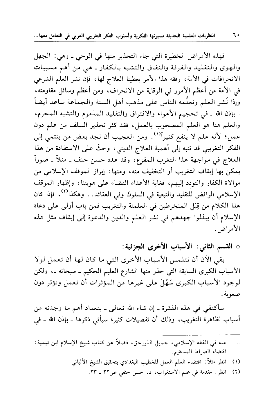 فهذه الأمراض الخطيرة التي جاء التحذير منها في الوحي -وهي: الجهل والهوى والتقليد والفرقة والنفاق والتشبه بالكفار- هي من أهم مسببات الانحرافات في الأمة، وفقه هذا الأمر يعطينا العلاج لها، فإن نشر العلم الشرعي في الأمة من أعظم الأمور في الوقاية من الانحراف، ومن أعظم وسائل مقاومته، وإذا نُشر العلم وتعلَّمه الناس على مذهب أهل السنة والجماعة ساعد أيضًا -بإذن الله- في تحجيم الأهواء والافتراق والتقليد المذموم والتشبه المحرم، والعلم هنا هو العلم المصحوب بالعمل، فقد كثر تحذير السلف من علم دون عمل؛ لأنه علم لا ينفع كثيرًا (¬1). ومن العجيب أن نجد بعض من ينتمي إلى الفكر التغريبي قد تنبه إلى أهمية العلاج المديني، وحثّ على الاستفادة من هذا العلاج في مواجهة هذا التغرب المفزع، وقد عدد حسن حنف -مثلًا- صورًا يمكن بها إيقاف التغريب أو التخفيف منه، ومنها: إبراز الموقف الإسلامي من موالاة الكفار والتودد إليهم، فغاية الأعداء القضاء على هويتنا، وإظهار الموقف الإسلامي الرافض للتقليد والتبعية في السلوك وفي العقائد. . وهكذا (¬2)، فإذا كان هذا الكلام من قِبَل المنخرطين في العلمنة والتغريب فمن باب أولى على دعاة الإسلام أن يبذلوا جهدهم في نشر العلم والدين والدعوة إلى إيقاف مثل هذه الأمراض.