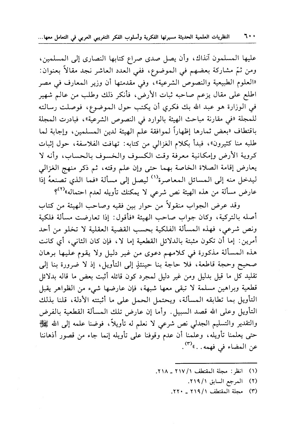 عليها المسلمون آنذاك، وأن يصل صدى صراع كتابها النصارى إلى المسلمين، ومن ثمّ مشاركة بعضهم في الموضوع، ففي العدد العاشر نجد مقالًا بعنوان: "العلوم الطبيعية والنصوص الشرعية"، وفي مقدمتها أن وزير المعارف في مصر اطلع على مقال يزعم صاحبه ثبات الأرض، فأنكر ذلك وطلب من عالم شهير في الوزارة هو عبد الله بك فكري أن يكتب حول الموضوع، فوصلت رسالته للمجلة "في مقارنة مباحث الهيئة بالوارد في النصوص الشرعية"، فبادرت المجلة باقتطاف "بعض ثمارها إظهارًا لموافقة علم الهيئة لدين المسلمين، وإجابة لما طلبه منا كثيرون"، فبدأ بكلام الغزالي من كتابه: تهافت الفلاسفة، حول إثبات كروية الأرض وإمكانية معرفة وقت الكسوف والخسوف بالحساب، وأنه لا يعارض إقامة الصلاة الخاصة بهما حتى وإن علم وقته، ثم ذكر منهج الغزالي ليدخل منه إلى المسائل المعاصرة (¬1) ليصل إلى مسألة "فما الذي تصنعهُ إذا عارض مسألة من هذه الهيئة نص شرعي لا يمكنك تأويله لعدم احتماله" (¬2)؟
