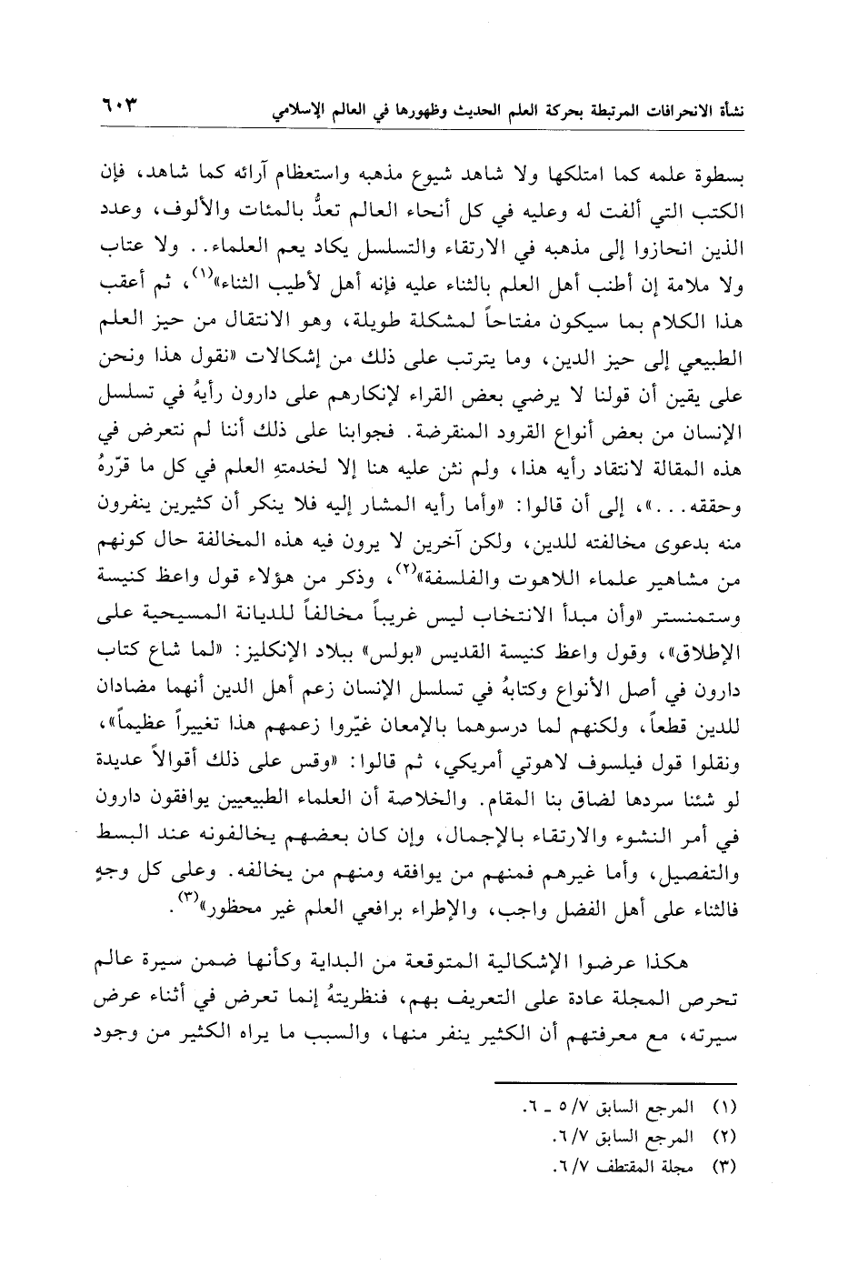 بسطوة علمه كما امتلكها ولا شاهد شيوع مذهبه واستعظام آرائه كما شاهد، فإن الكتب التي ألفت له وعليه في كل أنحاء العالم تعدُّ بالمئات والألوف، وعدد الذين انحازوا إلى مذهبه في الارتقاء والتسلسل يكاد يعم العلماء. . ولا عتاب ولا ملامة إن أطنب أهل العلم بالثناء عليه فإنه أهل لأطيب الثناء" (¬1)، ثم أعقب هذا الكلام بما سيكون مفتاحًا لمشكلة طويلة، وهو الانتقال من حيز العلم الطبيعي إلى حيز الدين، وما يترتب على ذلك من إشكالات "نقول هذا ونحن على يقين أن قولنا لا يرضي بعض القراء لإنكارهم على دارون رأيهُ في تسلسل الإنسان من بعض أنواع القرود المنقرضة. فجوابنا على ذلك أننا لم نتعرض في هذه المقالة لانتقاد رأيه هذا، ولم نثن عليه هنا إلا لخدمتهِ العلم في كل ما قرّرهُ وحققه. . . ."، إلى أن قالوا: "وأما رأيه المشار إليه فلا ينكر أن كثيرين ينفرون منه بدعوى مخالفته للدين، ولكن آخرين لا يرون فيه هذه المخالفة حال كونهم من مشاهير علماء اللاهوت والفلسفة" (¬2)، وذكر من هؤلاء قول واعظ كنيسة وستمنستر "وأن مبدأ الانتخاب ليس غريبًا مخالفًا للديانة المسيحية على الإطلاق"، وقول واعظ كنيسة القديس "بولس" ببلاد الإنكليز: "لما شاع كتاب دارون في أصل الأنواع وكتابهُ في تسلسل الإنسان زعم أهل الدين أنهما مضادان للدين قطعًا، ولكنهم لما درسوهما بالإمعان غيّروا زعمهم هذا تغييرًا عظيمًا"، ونقلوا قول فيلسوف لاهوتي أمريكي، ثم قالوا: "وقس على ذلك أقوالًا عديدة لو شئنا سردها لضاق بنا المقام. والخلاصة أن العلماء الطبيعيين يوافقون دارون في أمر النشوء والارتقاء بالإجمال، وإن كان بعضهم يخالفونه عند البسط والتفصيل، وأما غيرهم فمنهم من يوافقه ومنهم من يخالفه. وعلى كل وجهٍ فالثناء على أهل الفضل واجب، والإطراء برافعي العلم غير محظور" (¬3).