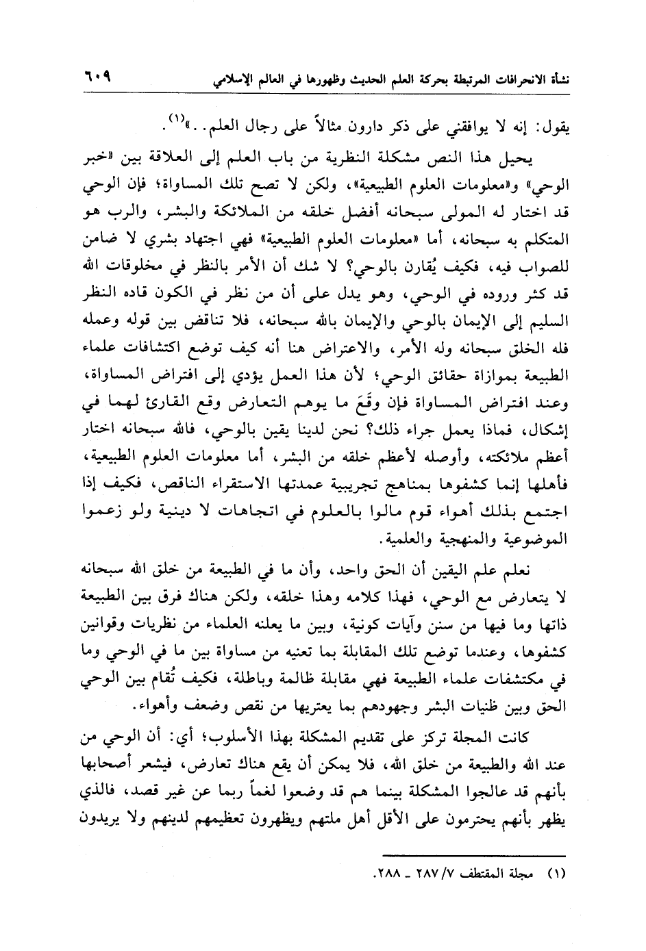 يحيل هذا النص مشكلة النظرية من باب العلم إلى العلاقة بين "خبر الوحي" و"معلومات العلوم الطبيعية"، ولكن لا تصح تلك المساواة؛ فإن الوحي قد اختار له المولى سبحانه أفضل خلقه من الملائكة والبشر، والرب هو المتكلم به سبحانه، أما "معلومات العلوم الطبيعية" فهي اجتهاد بشري لا ضامن للصواب فيه، فكيف يُقارن بالوحي؟ لا شك أن الأمر بالنظر في مخلوقات الله قد كثر وروده في الوحي، وهو يدل على أن من نظر في الكون قاده النظر السليم إلى الإيمان بالوحي والإيمان بالله سبحانه، فلا تناقض بين قوله وعمله فله الخلق سبحانه وله الأمر، والاعتراض هنا أنه كيف توضع اكتشافات علماء الطبيعة بموازاة حقائق الوحي؛ لأن هذا العمل يؤدي إلى افتراض المساواة، وعند افتراض المساواة فإن وقَعَ ما يوهم التعارض وقع القارئ لهما في إشكال، فماذا يعمل جراء ذلك؟ نحن لدينا يقين بالوحي، فالله سبحانه اختار أعظم ملائكته، وأوصله لأعظم خلقه من البشر، أما معلومات العلوم الطبيعية، فأهلها إنما كشفوها بمناهج تجريبية عمدتها الاستقراء الناقص، فكيف إذا اجتمع بذلك أهواء قوم مالوا بالعلوم في اتجاهات لا دينية ولو زعموا الموضوعية والمنهجية والعلمية.