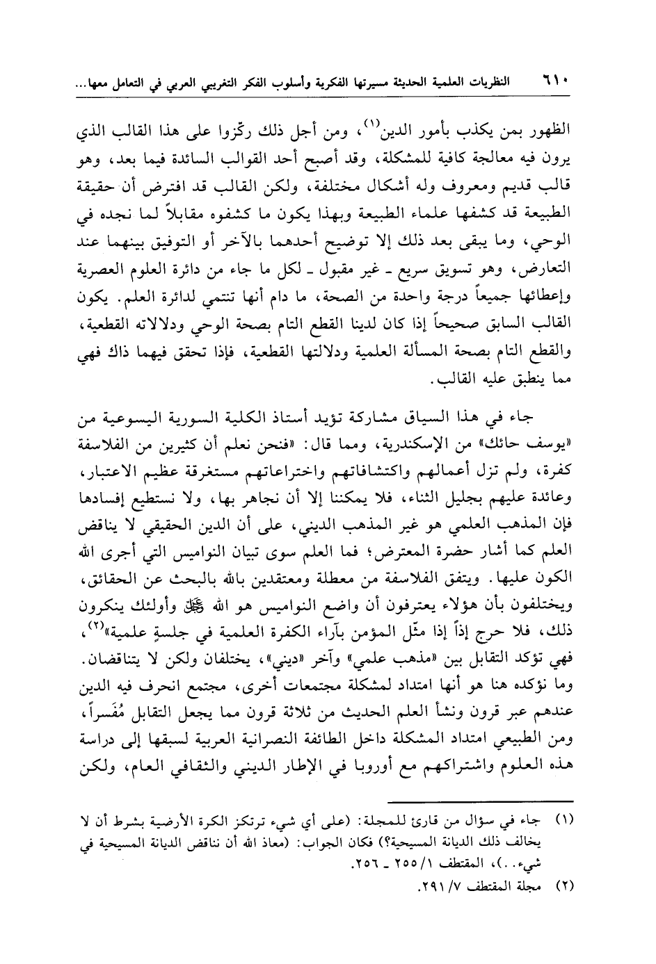 (¬1) جاء في سؤال من قارئ للمجلة: (على أي شيء ترتكز الكرة الأرضية بشرط أن لا يخالف ذلك الديانة المسيحية؟) فكان الجواب: (معاذ الله أن نناقض الديانة المسيحية في شيء. .)، المقتطف 1/ 255 - 256.