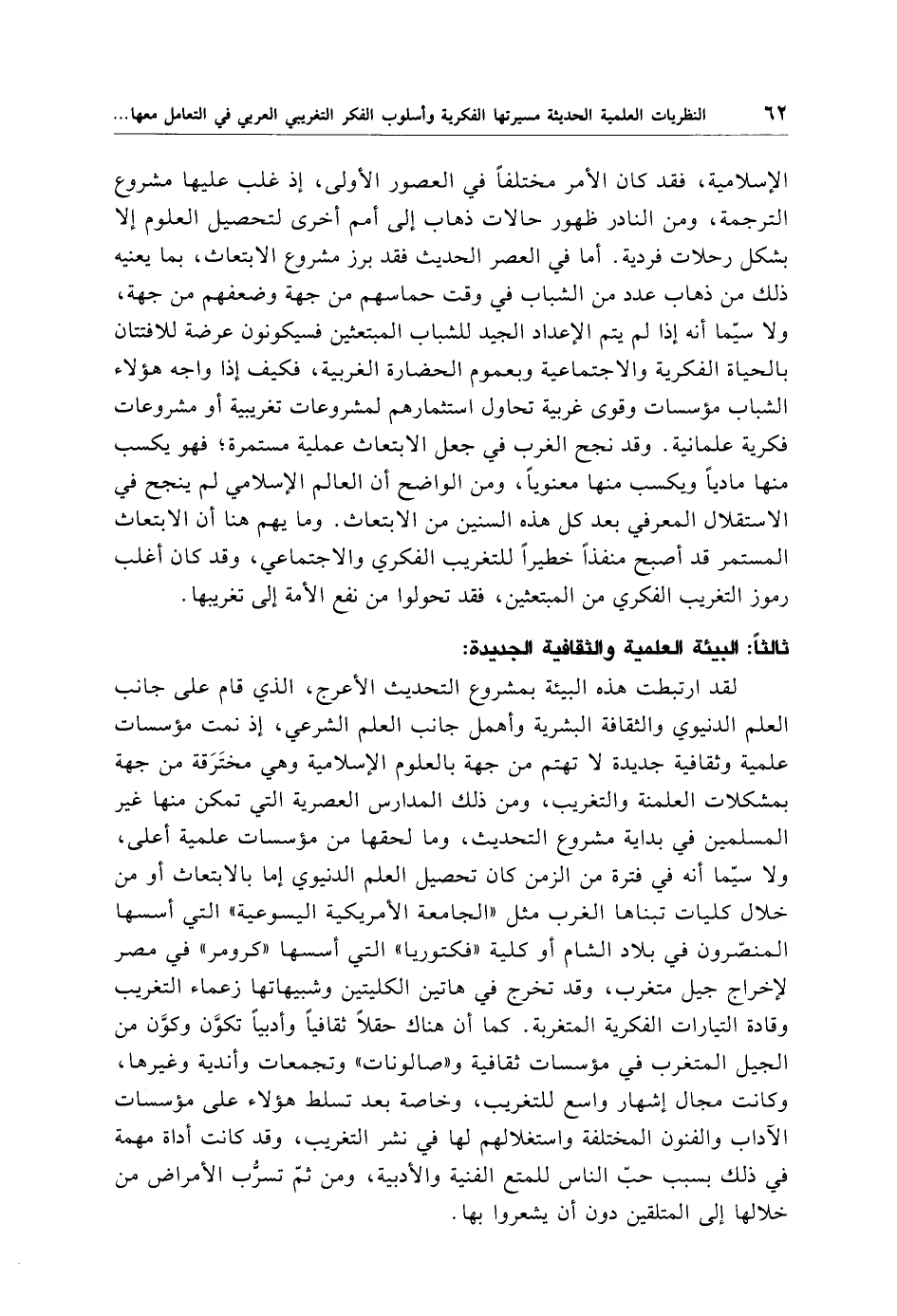 الإسلامية، فقد كان الأمر مختلفًا في العصور الأولى، إذ غلب عليها مشروع الترجمة، ومن النادر ظهور حالات ذهاب إلى أمم أخرى لتحصيل العلوم إلا بشكل رحلات فردية. أما في العصر الحديث فقد برز مشروع الابتعاث، بما يعنيه ذلك من ذهاب عدد من الشباب في وقت حماسهم من جهة وضعفهم من جهة، ولاسيّما أنه إذا لم يتم الإعداد الجيد للشباب المبتعثين فسيكونون عرضة للافتتان بالحياة الفكرية والاجتماعية وبعموم الحضارة الغربية، فكيف إذا واجه هؤلاء الشباب مؤسسات وقوى غربية تحاول استثمارهم لمشروعات تغريبية أو مشروعات فكرية علمانية. وقد نجح الغرب في جعل الابتعاث عملية مستمرة؛ فهو يكسب منها ماديًا ويكسب منها معنويًا، ومن الواضح أن العالم الإسلامي لم ينجح في الاستقلال المعرفي بعد كل هذه السنين من الابتعاث. وما يهم هنا أن الابتعاث المستمر قد أصبح منفذًا خطيرًا للتغريب الفكري والاجتماعي، وقد كان أغلب رموز التغريب الفكري من المبتعثين، فقد تحولوا من نفع الأمة إلى تغريبها.