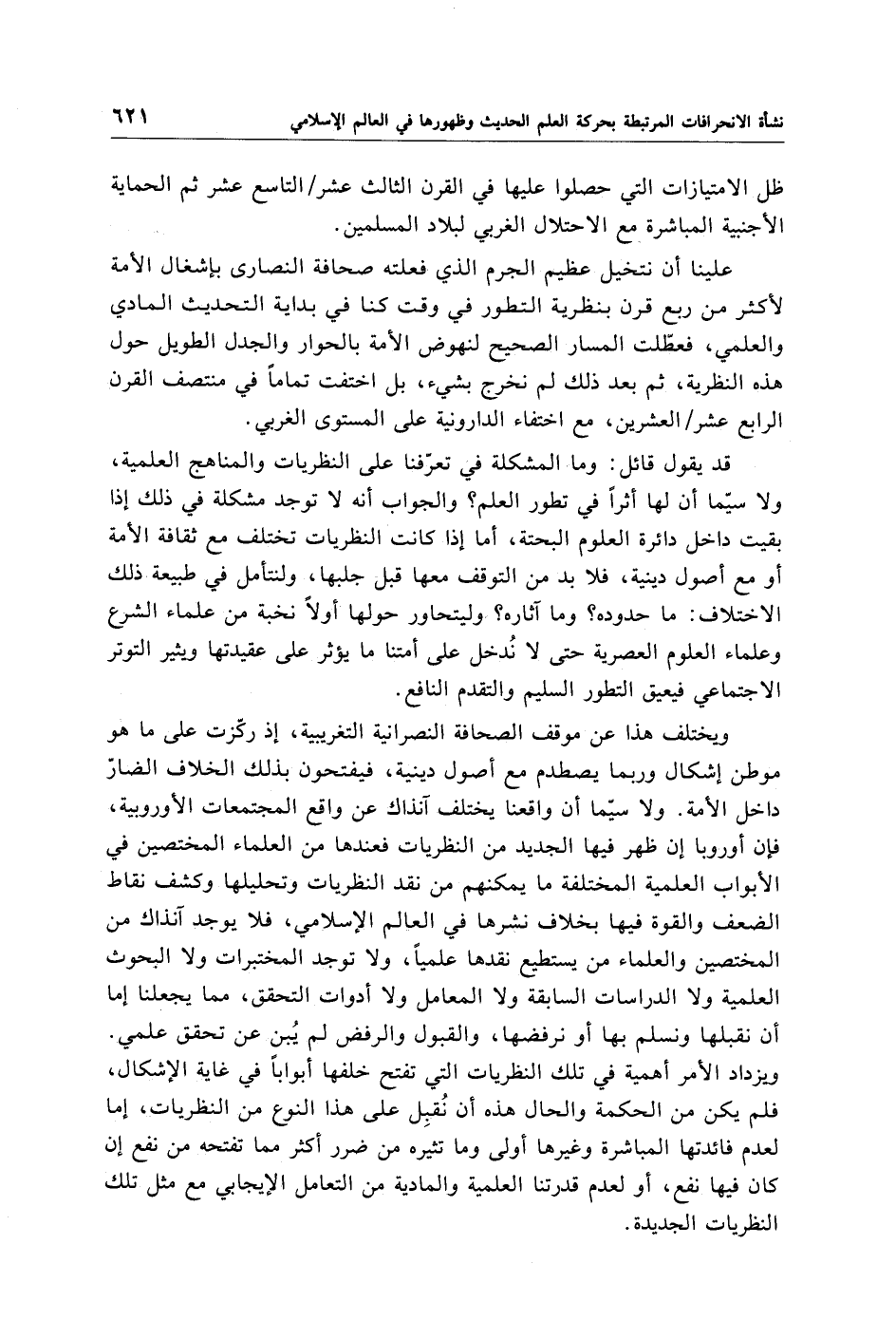 قد يقول قائل: وما المشكلة في تعرّفنا على النظريات والمناهج العلمية، ولاسيّما أن لها أثرًا في تطور العلم؟ والجواب أنه لا توجد مشكلة في ذلك إذا بقيت داخل دائرة العلوم البحتة، أما إذا كانت النظريات تختلف مع ثقافة الأمة أو مع أصول دينية، فلابد من التوقف معها قبل جلبها، ولنتأمل في طبيعة ذلك الاختلاف: ما حدوده؟ وما آثاره؟ وليتحاور حولها أولًا نخبة من علماء الشرع وعلماء العلوم العصرية حتى لا نُدخل على أمتنا ما يؤثر على عقيدتها ويثير التوتر الاجتماعي فيعيق التطور السليم والتقدم النافع.