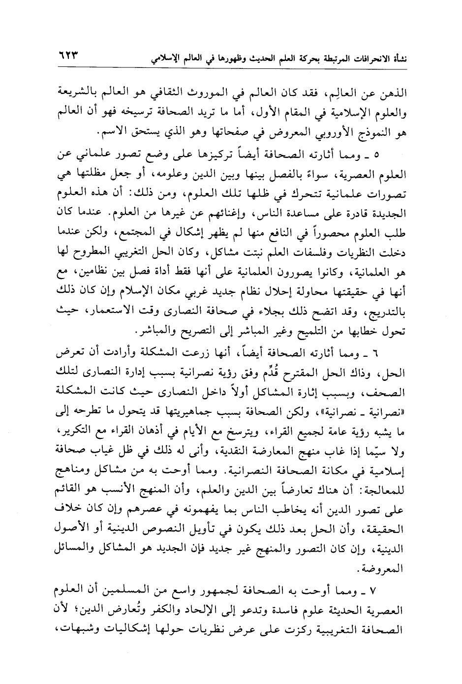 5 - ومما أثارته الصحافة أيضًا تركيزها على وضع تصور علماني عن العلوم العصرية، سواءً بالفصل بينها وبين الدين وعلومه، أو جعل مظلتها هي تصورات علمانية تتحرك في ظلها تلك العلوم، ومن ذلك: أن هذه العلوم الجديدة قادرة على مساعدة الناس، وإغنائهم عن غيرها من العلوم. عندما كان طلب العلوم محصورًا في النافع منها لم يظهر إشكال في المجتمع، ولكن عندما دخلت النظريات وفلسفات العلم نبتت مشاكل، وكان الحل التغريبي المطروح لها هو العلمانية، وكانوا يصورون العلمانية على أنها فقط أداة فصل بين نظامين، مع أنها في حقيقتها محاولة إحلال نظام جديد غربي مكان الإِسلام وإن كان ذلك بالتدريج، وقد اتضح ذلك بجلاء في صحافة النصارى وقت الاستعمار، حيث تحول خطابها من التلميح وغير المباشر إلى التصريح والمباشر.