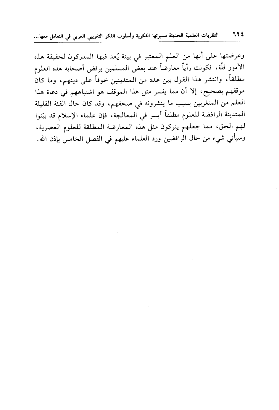 وعرضتها على أنها من العلم المعتبر في بيئة يُعد فيها المدركون لحقيقة هذه الأمور قلّة، فكونت رأيًا معارضًا عند بعض المسلمين يرفض أصحابه هذه العلوم مطلقًا، وانتشر هذا القول بين عدد من المتدينين خوفًا على دينهم، وما كان موقفهم بصحيح، إلا أن مما يفسر مثل هذا الموقف هو اشتباههم في دعاة هذا العلم من المتغربين بسبب ما ينشرونه في صحفهم، وقد كان حال الفئة القليلة المتدينة الرافضة للعلوم مطلقًا أيسر في المعالجة، فإن علماء الإِسلام قد بيّنوا لهم الحق، مما جعلهم يتركون مثل هذه المعارضة المطلقة للعلوم العصرية، وسيأتي شيء من حال الرافضين ورد العلماء عليهم في الفصل الخامس بإذن الله.
