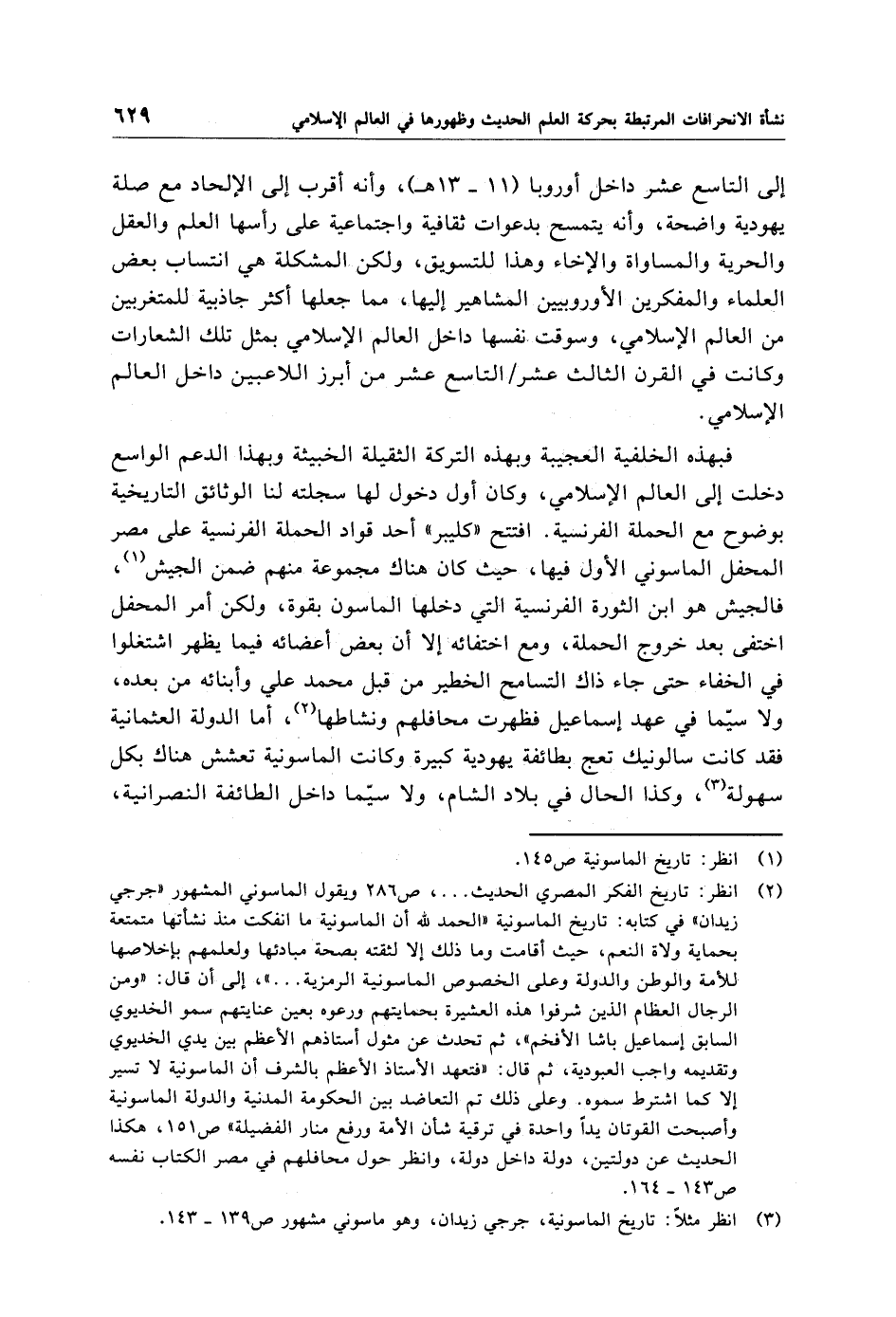 (¬2) انظر: تاريخ الفكر المصري الحديث. . . .، ص 286 ويقول الماسوني المشهور "جرجي زيدان" في كتابه: تاريخ الماسونية "الحمد لله أن الماسونية ما انفكت منذ نشأتها متمتعة بحماية ولاة النعم، حيث أقامت وما ذلك إلا لثقته بصحة مبادئها ولعلمهم بإخلاصها للأمة والوطن والدولة وعلى الخصوص الماسونية الرمزية. . . ."، إلى أن قال: "ومن الرجال العظام الذين شرفوا هذه العشيرة بحمايتهم ورعوه بعين عنايتهم سمو الخديوي السابق إسماعيل باشا الأفخم"، ثم تحدث عن مثول أستاذهم الأعظم بين يدي الخديوي وتقديمه واجب العبودية، ثم قال: "فتعهد الأستاذ الأعظم بالشرف أن الماسونية لا تسير إلا كما اشترط سموه. وعلى ذلك تم التعاضد بين الحكومة المدنية والدولة الماسونية وأصبحت القوتان يدًا واحدة في ترقية شأن الأمة ورفع منار الفضيلة" ص 151، هكذا الحديث عن دولتين، دولة داخل دولة، وانظر حول محافلهم في مصر الكتاب نفسه ص 143 - 164.