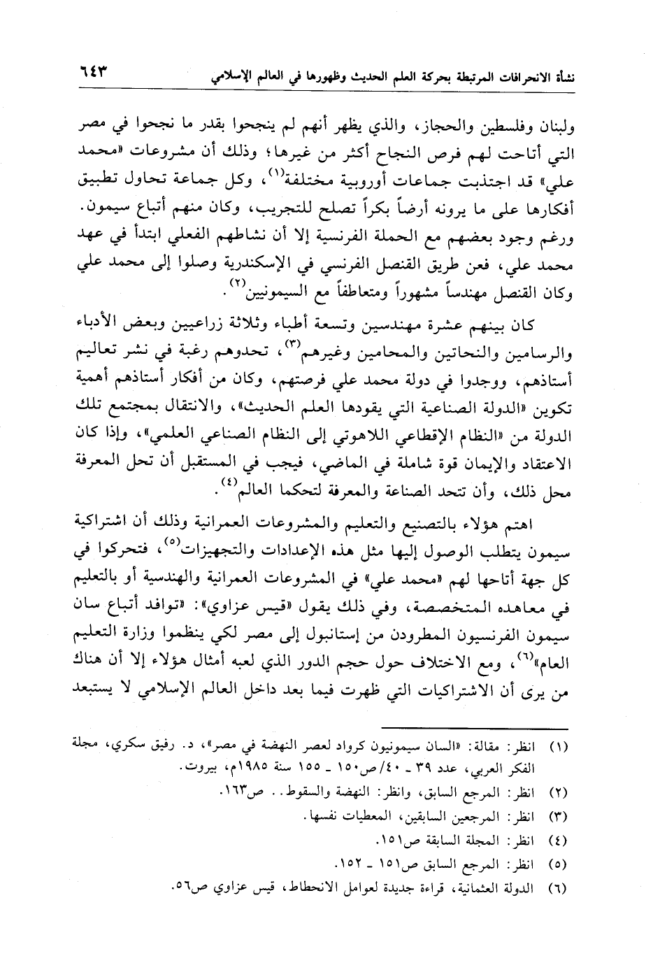 (¬1) انظر: مقالة: "السان سيمونيون كرواد لعصر النهضة في مصر"، د. رفيق سكري، مجلة الفكر العربي، عدد 39 - 40/ ص 150 - 155 سنة 1985 م، بيروت.