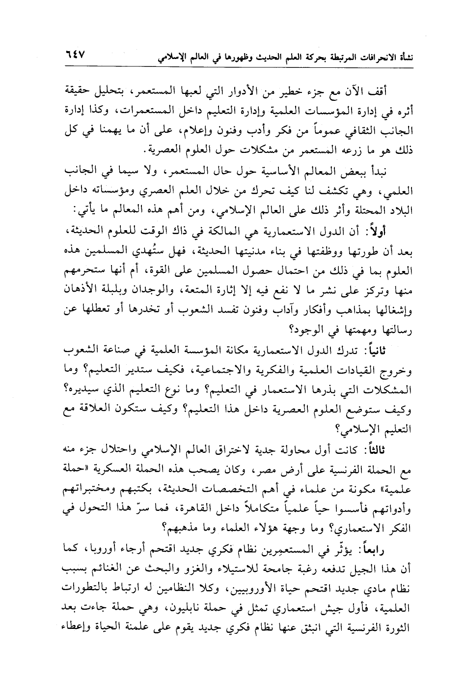 ثالثًا: كانت أول محاولة جدية لاختراق العالم الإِسلامي واحتلال جزء منه مع الحملة الفرنسية على أرض مصر، وكان يصحب هذه الحملة العسكرية "حملة علمية" مكونة من علماء في أهم التخصصات الحديثة، بكتبهم ومختبراتهم وأدواتهم فأسسوا حيًا علميًا متكاملًا داخل القاهرة، فما سرّ هذا التحول في الفكر الاستعماري؟ وما وجهة هؤلاء العلماء وما مذهبهم؟