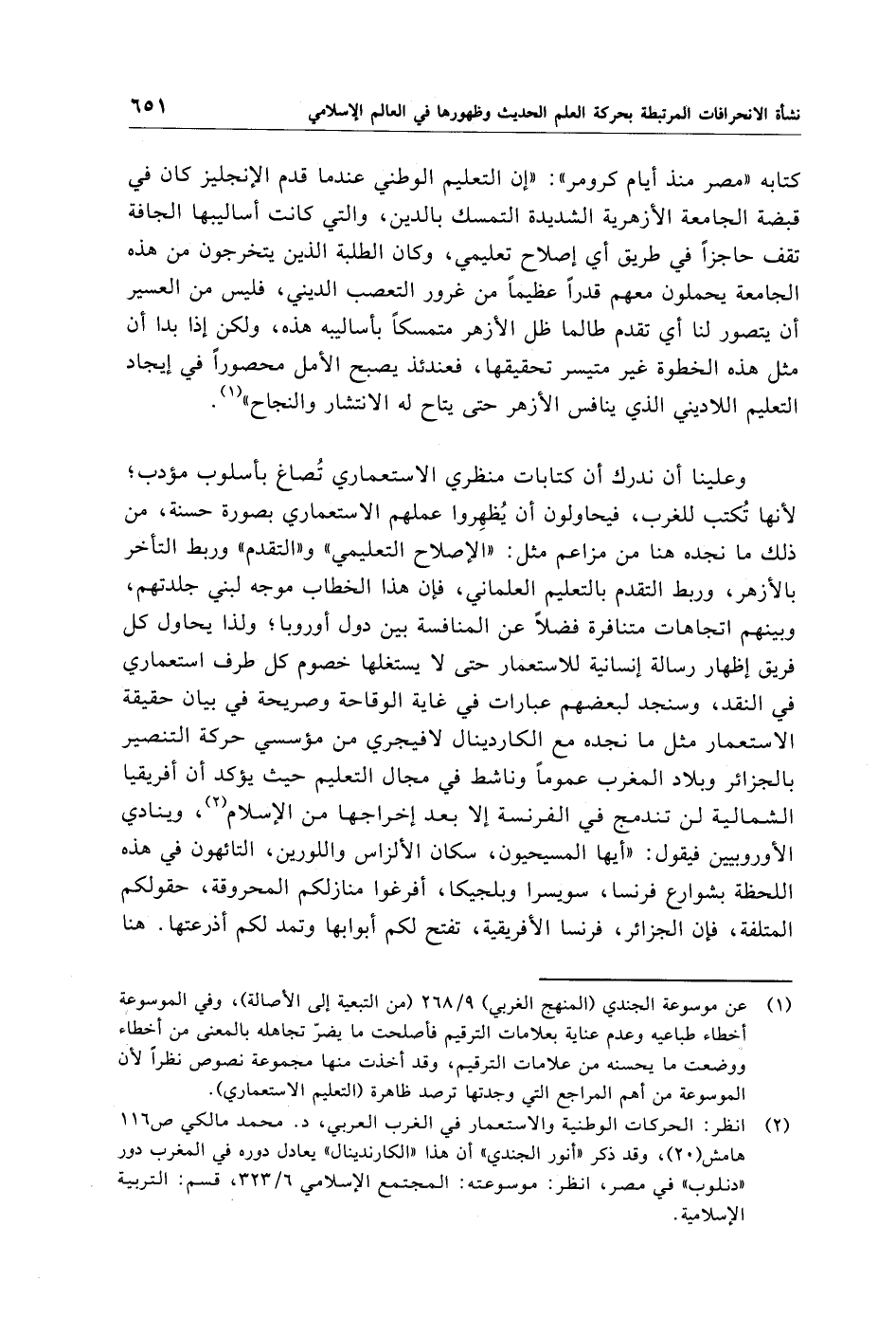 (¬1) عن موسوعة الجندي (المنهج الغربي) 9/ 268 (من التبعية إلى الأصالة)، وفي الموسوعة أخطاء طباعيه وعدم عناية بعلامات الترقيم فأصلحت ما يضرّ تجاهله بالمعنى من أخطاء ووضعت ما يحسنه من علامات الترقيم، وقد أخذت منها مجموعة نصوص نظرًا لأنّ الموسوعة من أهم المراجع التي وجدتها ترصد ظاهرة (التعليم الاستعماري).