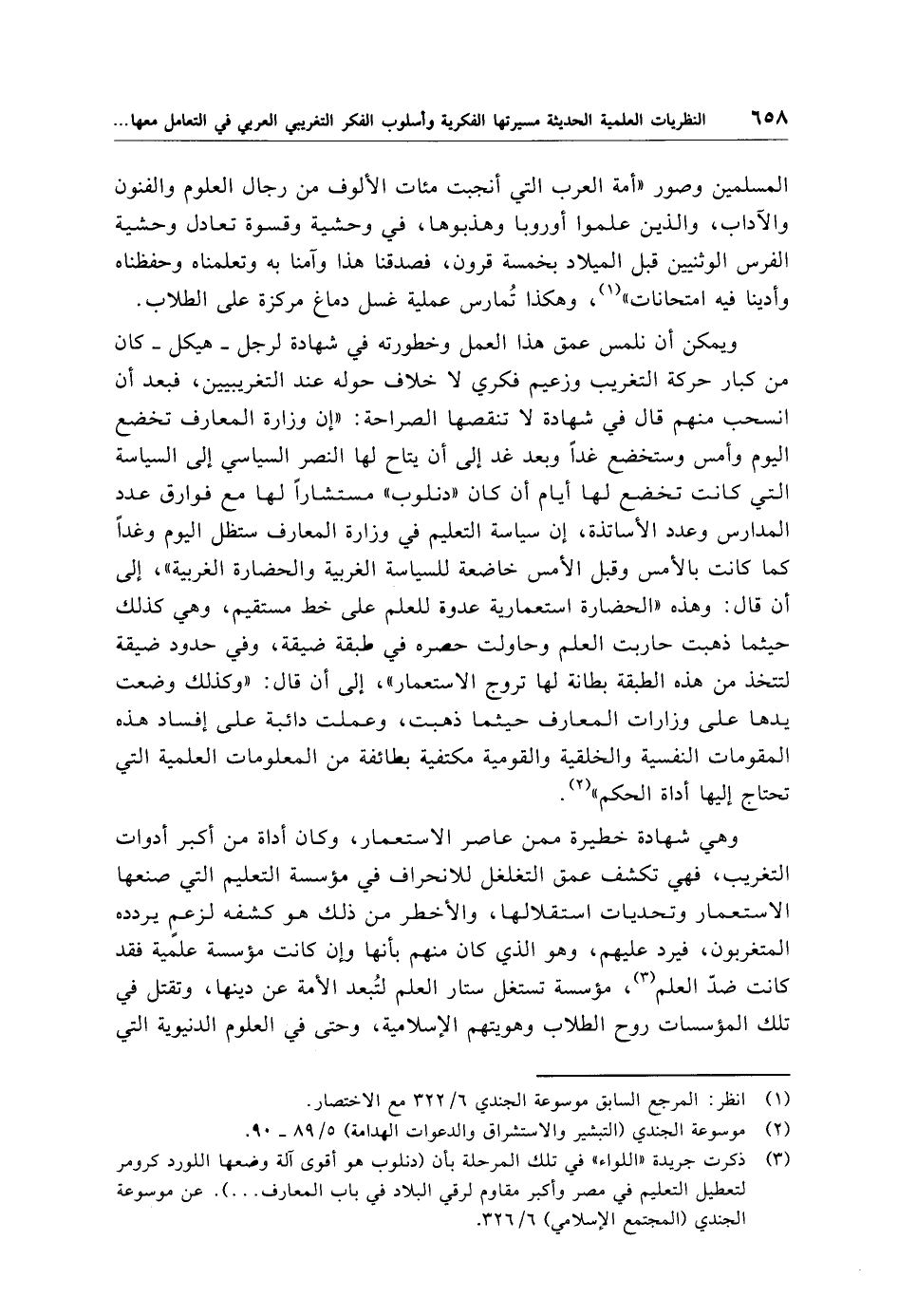 ويمكن أن نلمس عمق هذا العمل وخطورته في شهادة لرجل -هيكل- كان من كبار حركة التغريب وزعيم فكري لا خلاف حوله عند التغريبيين، فبعد أن انسحب منهم قال في شهادة لا تنقصها الصراحة: "إن وزارة المعارف تخضع اليوم وأمس وستخضع غدًا وبعد غد إلى أن يتاح لها النصر السياسي إلى السياسة التي كانت تخضع لها أيام أن كان "دنلوب" مستشارًا لها مع فوارق عدد المدارس وعدد الأساتذة، إن سياسة التعليم في وزارة المعارف ستظل اليوم وغدًا كما كانت بالأمس وقبل الأمس خاضعة للسياسة الغربية والحضارة الغربية"، إلى أن قال: وهذه "الحضارة استعمارية عدوة للعلم على خط مستقيم، وهي كذلك حيثما ذهبت حاربت العلم وحاولت حصره في طبقة ضيقة، وفي حدود ضيقة لتتخذ من هذه الطبقة بطانة لها تروج الاستعمار"، إلى أن قال: "وكذلك وضعت يدها على وزارات المعارف حيثما ذهبت، وعملت دائبة على إفساد هذه المقومات النفسية والخلقية والقومية مكتفية بطائفة من المعلومات العلمية التي تحتاج إليها أداة الحكم" (¬2).