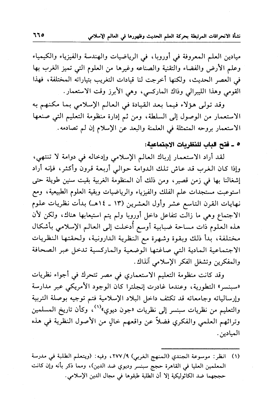 (¬1) انظر: موسوعة الجندي (المنهج الغربي) 9/ 277، وفيه: (ويتعلم الطلبة في مدرسة المعلمين العليا في القاهرة حجج سبنسر وديوي ضد الدين)، ومما ذكر بأنّه وإن كانت حججهما ضد الكاثوليكية إلا أن الطلبة طبقوها في مجال الدين الإِسلامي.