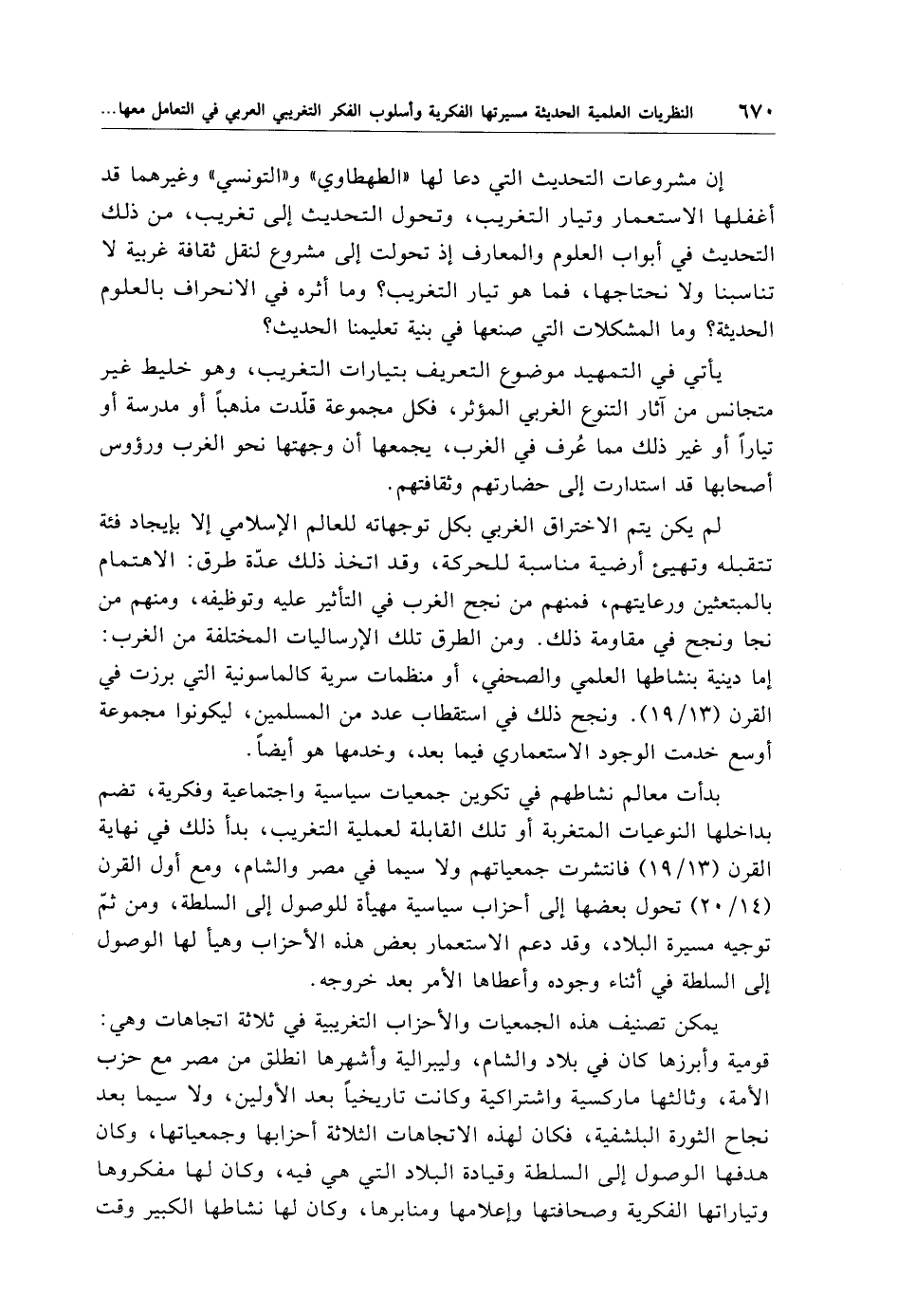 إن مشروعات التحديث التي دعا لها "الطهطاوي" و"التونسي" وغيرهما قد أغفلها الاستعمار وتيار التغريب، وتحول التحديث إلى تغريب، من ذلك التحديث في أبواب العلوم والمعارف إذ تحولت إلى مشروع لنقل ثقافة غربية لا تناسبنا ولا نحتاجها، فما هو تيار التغريب؟ وما أثره في الانحراف بالعلوم الحديثة؟ وما المشكلات التي صنعها في بنية تعليمنا الحديث؟