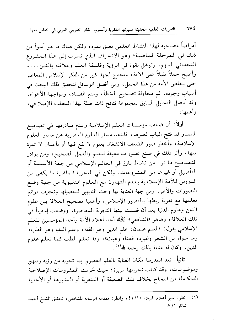 أمراضًا مصاحبة لهذا النشاط العلمي تعليق نموه، ولكن هناك ما هو أسوأ من ذلك في المرحلة الماضية؛ وهو الانحراف الذي تسرب إلى هذا المشروع التحديثي المهم، وتوغل بقوة في الرؤية وفلسفة العلم وعلاقته بالدين. . . .، وأصبح حملًا ثقيلًا على الأمة، ويحتاج لجهد كبير من الفكر الإِسلامي المعاصر حتى يخلص الأمة من هذا الحمل، ومن أفضل الوسائل لتحقيق ذلك البحث في أسباب وجوده، ثم محاولة تصحيح الخطأ، ومنع الفساد، ومواجهة الأهواء، وقد أوصل التحليل السابق لمجموعة نتائج ذات صلة بهذا المطلب الإصلاحي، وأهمها: