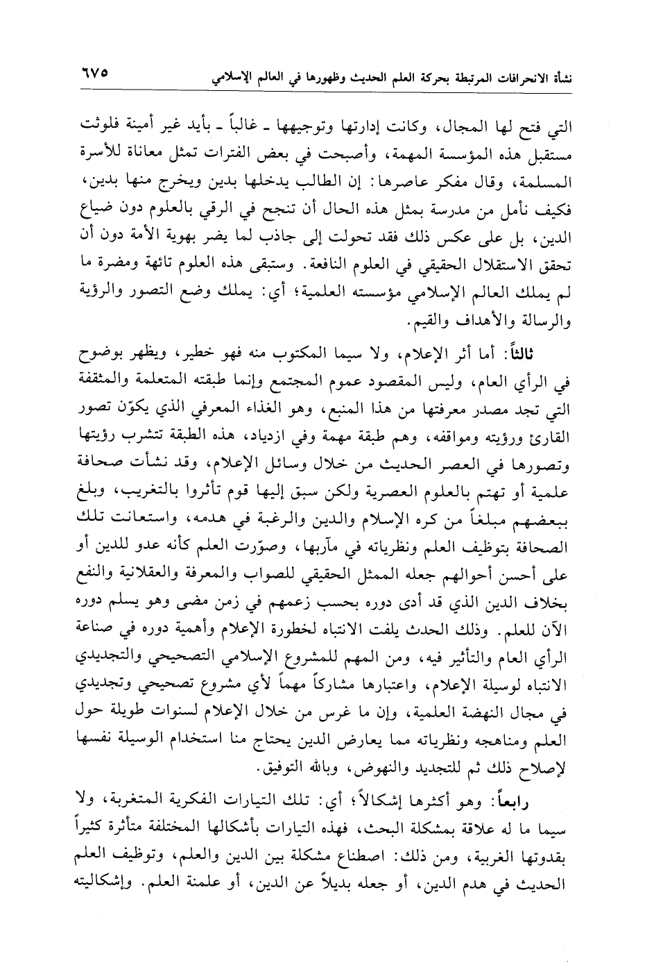 ثالثًا: أما أثر الإعلام، ولاسيما المكتوب منه فهو خطير، ويظهر بوضوح في الرأي العام، وليس المقصود عموم المجتمع وإنما طبقته المتعلمة والمثقفة التي تجد مصدر معرفتها من هذا المنبع، وهو الغذاء المعرفي الذي يكوّن تصور القارئ ورؤيته ومواقفه، وهم طبقة مهمة وفي ازدياد، هذه الطبقة تتشرب رؤيتها وتصورها في العصر الحديث من خلال وسائل الإعلام، وقد نشأت صحافة علمية أو تهتم بالعلوم العصرية ولكن سبق إليها قوم تأثروا بالتغريب، وبلغ ببعضهم مبلغًا من كره الإِسلام والدين والرغبة في هدمه، واستعانت تلك الصحافة بتوظيف العلم ونظرياته في مآربها، وصوّرت العلم كأنه عدو للدين أو على أحسن أحوالهم جعله الممثل الحقيقي للصواب والمعرفة والعقلانية والنفع بخلاف الدين الذي قد أدى دوره بحسب زعمهم في زمن مضى وهو يسلم دوره الآن للعلم. وذلك الحدث يلفت الانتباه لخطورة الإعلام وأهمية دوره في صناعة الرأي العام والتأثير فيه، ومن المهم للمشروع الإِسلامي التصحيحي والتجديدي الانتباه لوسيلة الإعلام، واعتبارها مشاركًا مهمًا لأي مشروع تصحيحي وتجديدي في مجال النهضة العلمية، وإن ما غرس من خلال الإعلام لسنوات طويلة حول العلم ومناهجه ونظرياته مما يعارض الدين يحتاج منا استخدام الوسيلة نفسها لإصلاح ذلك ثم للتجديد والنهوض، وبالله التوفيق.