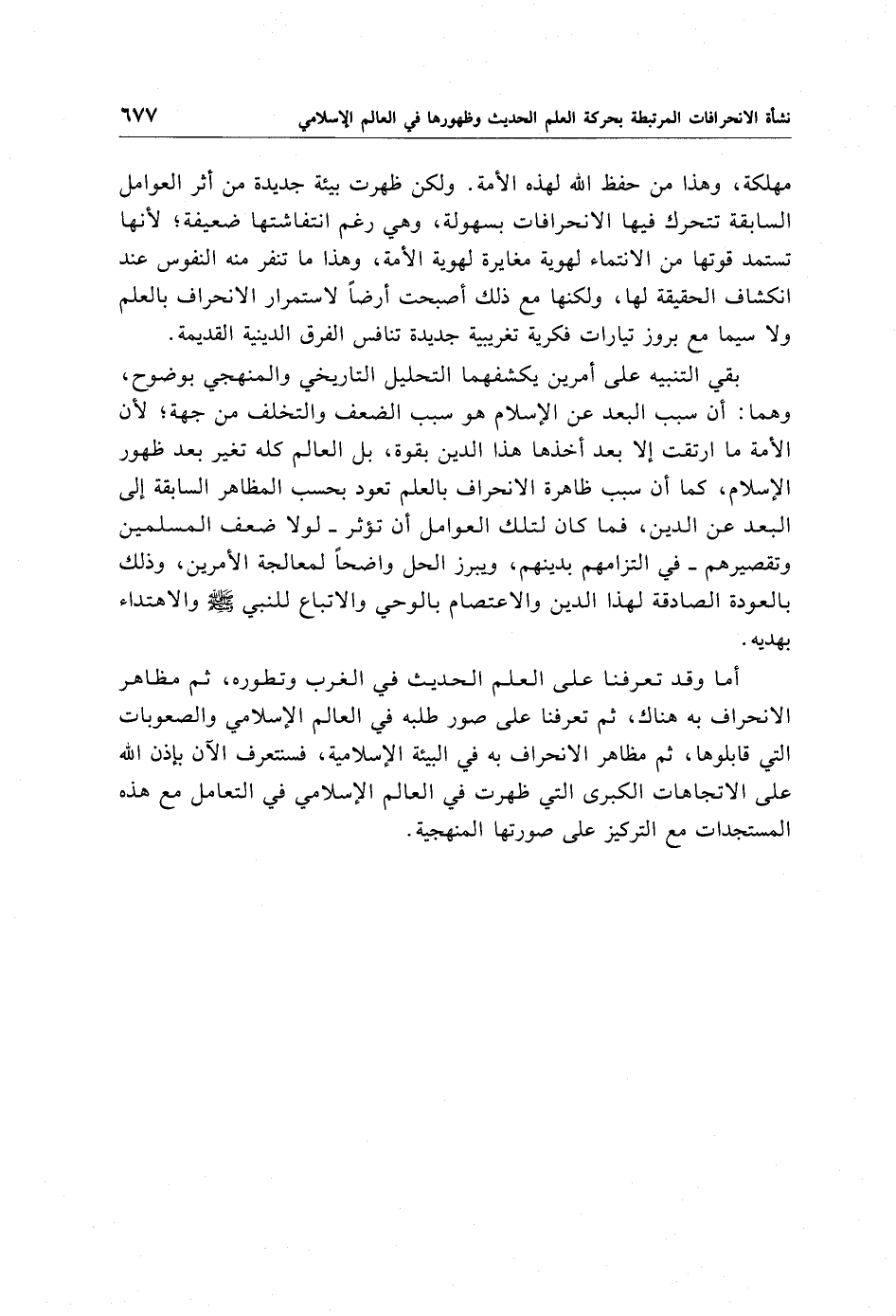 بقي التنبيه على أمرين يكشفهما التحليل التاريخي والمنهجي بوضوح، وهما: أن سبب البعد عن الإِسلام هو سبب الضعف والتخلف من جهة؛ لأن الأمة ما ارتقت إلا بعد أخذها هذا الدين بقوة، بل العالم كله تغير بعد ظهور الإِسلام، كما أن سبب ظاهرة الانحراف بالعلم تعود بحسب المظاهر السابقة إلى البعد عن الدين، فما كان لتلك العوامل أن تؤثر -لولا ضعف المسلمين وتقصيرهم- في التزامهم بدينهم، ويبرز الحل واضحًا لمعالجة الأمرين، وذلك بالعودة الصادقة لهذا الدين والاعتصام بالوحي والاتباع للنبي -صلى الله عليه وسلم- والاهتداء بهديه.