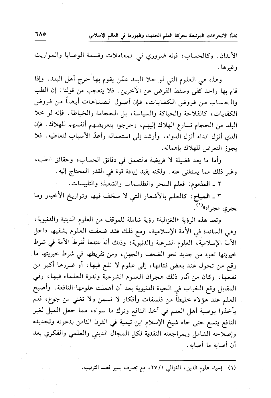 وتعد هذه الرؤية "الغزالية" رؤية شاملة للموقف من العلوم الدينية والدنيوية، وهي السائدة في الأمة الإِسلامية، ومع ذلك فقد ضعفت العلوم بشقيها داخل الأمة الإِسلامية، العلوم الشرعية والدنيوية؛ وذلك أنه عندما تُفرط الأمة في شرط خيريتها تعود من جديد نحو الضعف والجهل، ومن تفريطها في شرط خيريتها ما وقع من تحول عند بعض فئاتها، إلى علوم لا نفع فيها، أو ضررها أكبر من نفعها، وكان من آثار ذلك هجران العلوم الشرعية وندرة العلماء فيها، وفي المقابل وقع الخراب في الحياة الدنيوية بعد أن أهملت علومها النافعة. وأصبح العلم عند هؤلاء خليطًا من فلسفات وأفكار لا تسمن ولا تغني من جوع، فلم يأخذوا بوصية أهل العلم في أخذ النافع وترك ما سواه، مما جعل الميل لغير النافع يتسع حتى جاء شيخ الإِسلام ابن تيمية في القرن الثامن بدعوته وتجديده وإصلاحه الشامل وبمراجعته النقدية لكل المجال الديني والعلمي والفكري بعد أن أصابه ما أصابه.