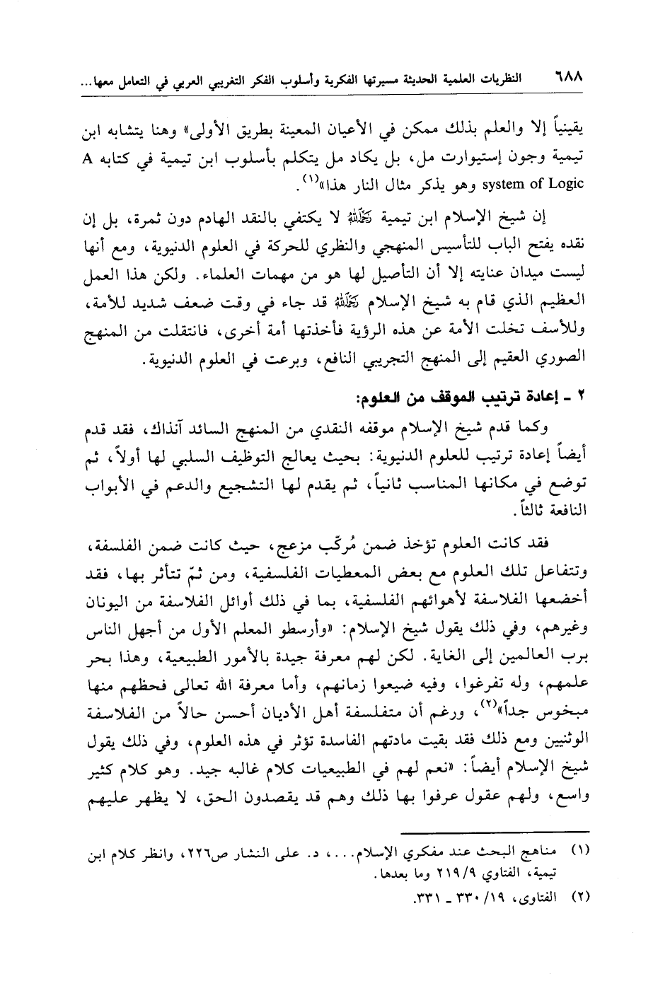 (¬1) مناهج البحث عند مفكري الإِسلام. . . .، د. على النشار ص 226، وانظر كلام ابن تيمية، الفتاوي 9/ 219 وما بعدها.
