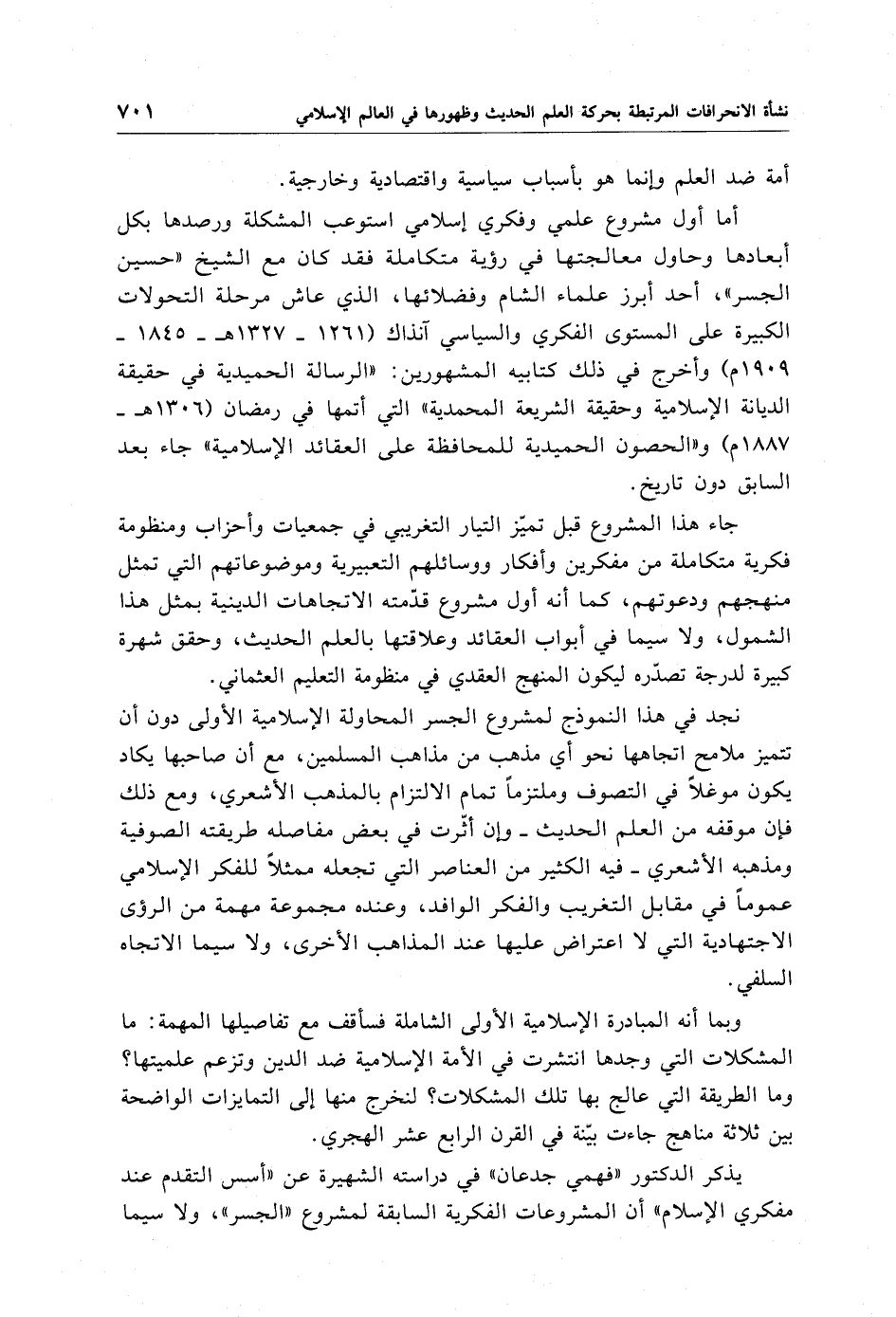 أما أول مشروع علمي وفكري إسلامي استوعب المشكلة ورصدها بكل أبعادها وحاول معالجتها في رؤية متكاملة فقد كان مع الشيخ "حسين الجسر"، أحد أبرز علماء الشام وفضلائها، الذي عاش مرحلة التحولات الكبيرة على المستوى الفكري والسياسي آنذاك (1261 - 1327 هـ -1845 - 1909 م) وأخرج في ذلك كتابيه المشهورين: "الرسالة الحميدية في حقيقة الديانة الإِسلامية وحقيقة الشريعة المحمدية" التي أتمها في رمضان (1306 هـ - 1887 م) و"الحصون الحميدية للمحافظة على العقائد الإسلامية" جاء بعد السابق دون تاريخ.