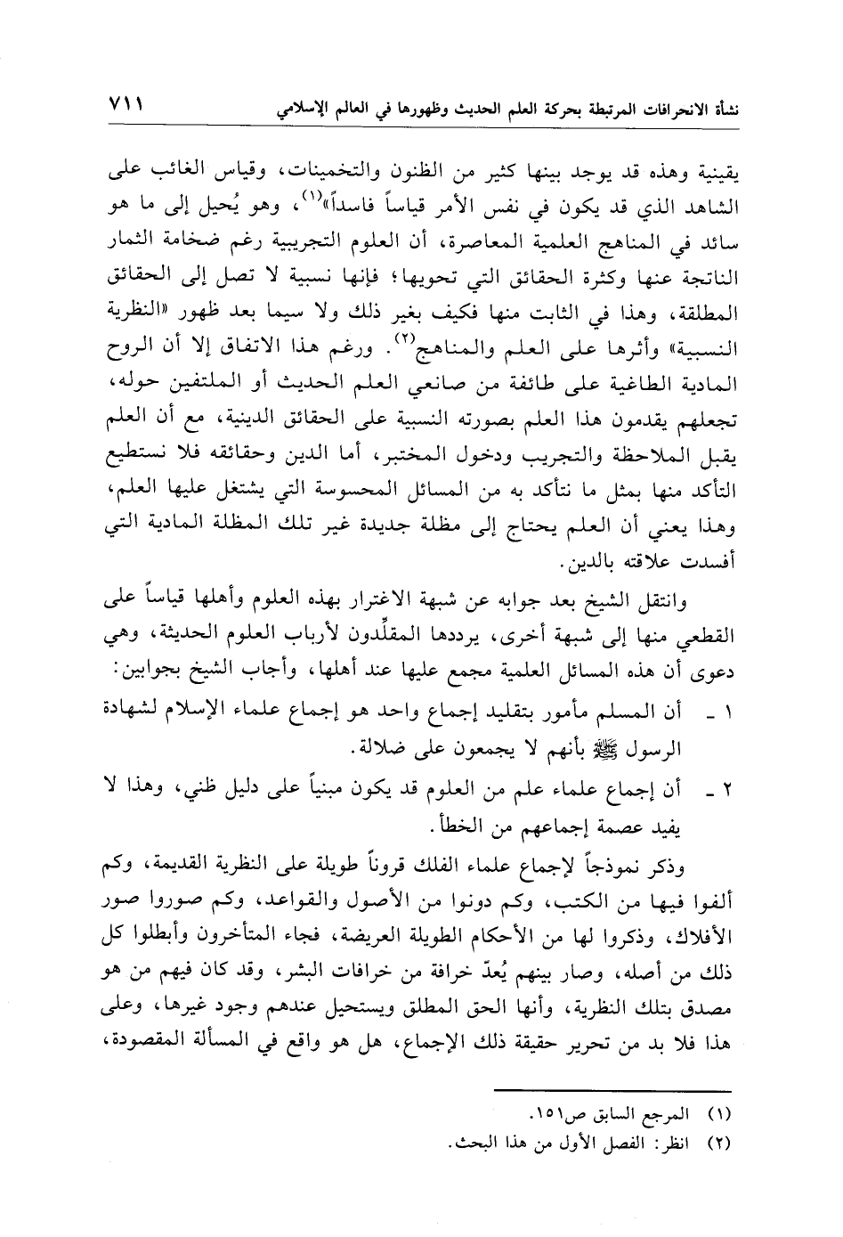 وانتقل الشيخ بعد جوابه عن شبهة الاغترار بهذه العلوم وأهلها قياسًا على القطعي منها إلى شبهة أخرى، يرددها المقلِّدون لأرباب العلوم الحديثة، وهي دعوى أن هذه المسائل العلمية مجمع عليها عند أهلها، وأجاب الشيخ بجوابين: