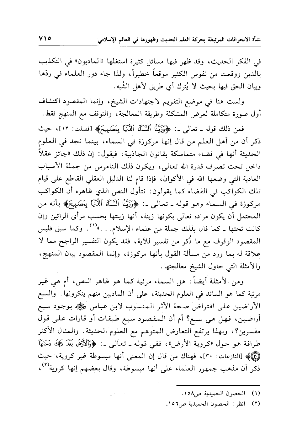 فمن ذلك قوله -تعالى-: {وَزَيَّنَّا السَّمَاءَ الدُّنْيَا بِمَصَابِيحَ} [فصلت: 12]، حيث ذكر أن من أهل العلم من قال إنها مركوزة في السماء، بينما نجد في العلوم الحديثة أنها في فضاء متماسكة بقانون الجاذبية، فيقول: إن ذلك "جائز عقلًا داخل تحت تصرف قدرة الله تعالى، ويكون ذلك الناموس من جملة الأسباب العادية التي وضعها الله في الأكوان، فإذا قام لنا الدليل العقلي القاطع على قيام تلك الكواكب في الفضاء كما يقولون: نتأول النص الذي ظاهره أن الكواكب مركوزة في السماء وهو قوله -تعالى-: {وَزَيَّنَّا السَّمَاءَ الدُّنْيَا بِمَصَابِيحَ} بأنه من المحتمل أن يكون مراده تعالى بكونها زينة، أنها زينتها بحسب مرأى الرائين وإن كانت تحتها- كما قال بذلك جملة من علماء الإِسلام. . . ." (¬1). وكما سبق فليس المقصود الوقوف مع ما ذُكر من تفسير للآية، فقد يكون التفسير الراجح مما لا علاقة له بما ورد من مسألة القول بأنها مركوزة، وإنما المقصود بيان المنهج، والأمثلة التي حاول الشيخ معالجتها.