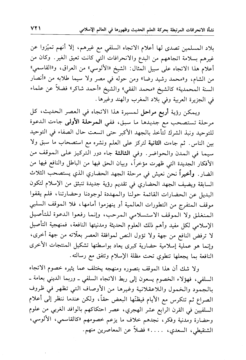 ولا شك أن هذا الموقف بتصوره ومنهجه يختلف عما يثيره خصوم الاتجاه السلفي، فهؤلاء الخصوم يسعون إلى ربط الاتجاه السلفي -وربما الديني بعامة- بالجمود والخمول واللاعقلانية وغيرها من الأوصاف التي تظهر في ظروف الصراع ثم تتكرس مع الأيام فيظنّها البعض حقًا، ولكن عندما ننظر إلى أعلام السلفيين في القرن الرابع عشر الهجري، عصر احتكاكهم بالوافد الغربي من علوم وحضارة ومدنية وفكر، نجدهم خلاف ما يزعم خصومهم "كالقاسمي، الألوسي، الشنقيطي، السعدي،. . . . " فضلًا عن المعاصرين منهم.