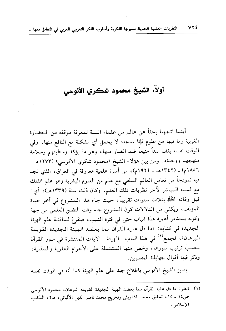 أينما اتجهنا بحثًا عن عالم من علماء السنة لمعرفة موقفه من الحضارة الغربية وما فيها من علوم فإنا سنجده لا يحمل أي مشكلة مع النافع منها، وفي الوقت نفسه يقف سدًا منيعًا ضد الضار منها، وهو ما يؤكد وسطيتهم وسلامة منهجهم ووحدته. ومن بين هؤلاء الشيخ "محمود شكري الألوسي" (1273 هـ- 1856 م) - (1342 هـ -1924 م)، من أسرة علمية معروفة في العراق، الذي نجد فيه نموذجًا من تعامل العالم السلفي مع علم من العلوم البشرية وهو علم الفلك مع لمسه المباشر لآخر نظريات ذلك العلم، وكان ذلك سنة (1339 هـ)؛ أي: قبل وفاته -رحمه الله- بثلاث سنوات تقريبًا، حيث جاء هذا المشروع في آخر حياة المؤلف، ويكفي من الدلالات كون المشروع جاء وقت النضج العلمي من جهة وكونه يستشعر أهمية هذا الباب حتى في فترة الشيب، فيتفرغ لمناقشة علم الهيئة الجديدة في كتابه: "ما دلّ عليه القرآن مما يعضد الهيئة الجديدة القويمة البرهان"، فجمع (¬1) في هذا الباب -الهيئة- الآيات المنتشرة في سور القرآن بحسب ترتيب سورها، وخص منها المشتملة على الأجرام العلوية والسفلية، وذكر فيها أقوال جهابذة المفسرين.