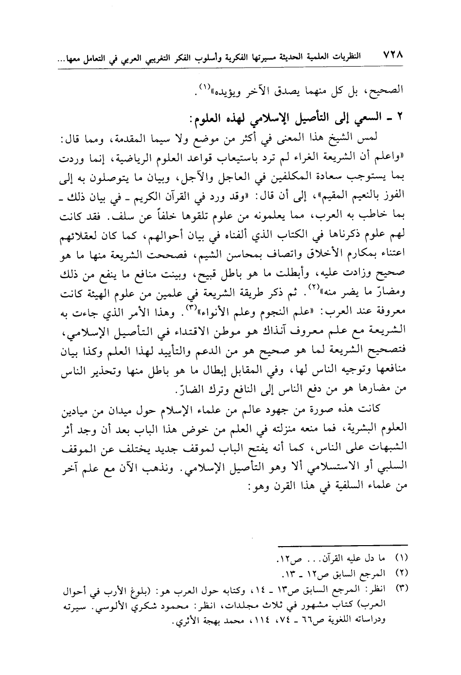 لمس الشيخ هذا المعنى في أكثر من موضع ولاسيما المقدمة، ومما قال: "واعلم أن الشريعة الغراء لم ترد باستيعاب قواعد العلوم الرياضية، إنما وردت بما يستوجب سعادة المكلفين في العاجل والآجل، وبيان ما يتوصلون به إلى الفوز بالنعيم المقيم"، إلى أن قال: "وقد ورد في القرآن الكريم -في بيان ذلك- بما خاطب به العرب، مما يعلمونه من علوم تلقوها خلفًا عن سلف. فقد كانت لهم علوم ذكرناها في الكتاب الذي ألفناه في بيان أحوالهم، كما كان لعقلائهم اعتناء بمكارم الأخلاق واتصاف بمحاسن الشيم، فصححت الشريعة منها ما هو صحيح وزادت عليه، وأبطلت ما هو باطل قبيح، وبينت منافع ما ينفع من ذلك ومضارّ ما يضر منه" (¬2). ثم ذكر طريقة الشريعة في علمين من علوم الهيئة كانت معروفة عند العرب: "علم النجوم وعلم الأنواء" (¬3). وهذا الأمر الذي جاءت به الشريعة مع علم معروف آنذاك هو موطن الاقتداء في التأصيل الإِسلامي، فتصحيح الشريعة لما هو صحيح هو من الدعم والتأييد لهذا العلم وكذا بيان منافعها وتوجيه الناس لها، وفي المقابل إبطال ما هو باطل منها وتحذير الناس من مضارها هو من دفع الناس إلى النافع وترك الضارّ.
