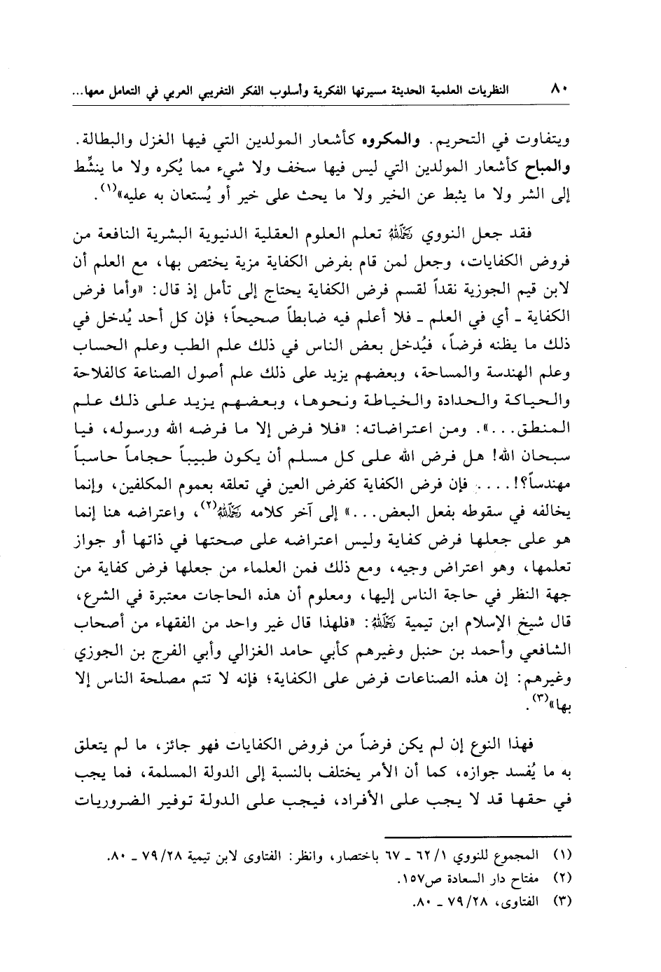 فقد جعل النووي -رحمه الله- تعلم العلوم العقلية الدنيوية البشرية النافعة من فروض الكفايات، وجعل لمن قام بفرض الكفاية مزية يختص بها، مع العلم أن لابن قيم الجوزية نقدًا لقسم فرض الكفاية يحتاج إلى تأمل إذ قال: "وأما فرض الكفاية -أي في العلم- فلا أعلم فيه ضابطًا صحيحًا؛ فإن كل أحد يُدخل في ذلك ما يظنه فرضًا، فيُدخل بعض الناس في ذلك علم الطب وعلم الحساب وعلم الهندسة والمساحة، وبعضهم يزيد على ذلك علم أصول الصناعة كالفلاحة والحياكة والحدادة والخياطة ونحوها، وبعضهم يزيد على ذلك علم المنطق. . . .". ومن اعتراضاته: "فلا فرض إلا ما فرضه الله ورسوله، فيا سبحان الله! هل فرض الله على كل مسلم أن يكون طبيبًا حجامًا حاسبًا مهندسًا؟!. . . . فإن فرض الكفاية كفرض العين في تعلقه بعموم المكلفين، وإنما يخالفه في سقوطه بفعل البعض. . . ." إلى آخر كلامه - رحمه الله - (¬2)، واعتراضه هنا إنما هو على جعلها فرض كفاية وليس اعتراضه على صحتها في ذاتها أو جواز تعلمها، وهو اعتراض وجيه، ومع ذلك فمن العلماء من جعلها فرض كفاية من جهة النظر في حاجة الناس إليها، ومعلوم أن هذه الحاجات معتبرة في الشرع، قال شيخ الإسلام ابن تيمية - رحمه الله -: "فلهذا قال غير واحد من الفقهاء من أصحاب الشافعي وأحمد بن حنبل وغيرهم كأبي حامد الغزالي وأبي الفرج بن الجوزي وغيرهم: إن هذه الصناعات فرض على الكفاية؛ فإنه لا تتم مصلحة الناس إلا بها" (¬3).