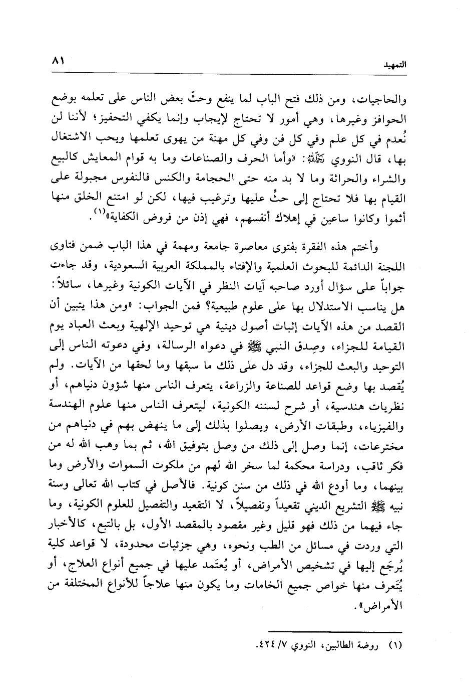 وأختم هذه الفقرة بفتوى معاصرة جامعة ومهمة في هذا الباب ضمن فتاوى اللجنة الدائمة للبحوث العلمية والإفتاء بالمملكة العربية السعودية، وقد جاءت جوابًا على سؤال أورد صاحبه آيات النظر في الآيات الكونية وغيرها، سائلًا: هل يناسب الاستدلال بها على علوم طبيعية؟ فمن الجواب: "ومن هذا يتبين أن القصد من هذه الآيات إثبات أصول دينية هي توحيد الإلهية وبعث العباد يوم القيامة للجزاء، وصِدق النبي - صلى الله عليه وسلم - في دعواه الرسالة، وفي دعوته الناس إلى التوحيد والبعث للجزاء، وقد دل على ذلك ما سبقها وما لحقها من الآيات. ولم يُقصد بها وضع قواعد للصناعة والزراعة، يتعرف الناس منها شؤون دنياهم، أو نظريات هندسية، أو شرح لسننه الكونية، ليتعرف الناس منها علوم الهندسة والفيزياء، وطبقات الأرض، ويصلوا بذلك إلى ما ينهض بهم في دنياهم من مخترعات، إنما وصل إلى ذلك من وصل بتوفيق الله، ثم بما وهب الله له من فكر ثاقب، ودراسة محكمة لما سخر الله لهم من ملكوت السموات والأرض وما بينهما، وما أودع الله في ذلك من سنن كونية. فالأصل في كتاب الله تعالى وسنة نبيه - صلى الله عليه وسلم - التشريع الديني تقعيدًا وتفصيلًا، لا التقعيد والتفصيل للعلوم الكونية، وما جاء فيهما من ذلك فهو قليل وغير مقصود بالمقصد الأول، بل بالتبع، كالأخبار التي وردت في مسائل من الطب ونحوه، وهي جزئيات محدودة، لا قواعد كلية يُرجَع إليها في تشخيص الأمراض، أو يُعتَمد عليها في جميع أنواع العلاج، أو يُتَعرف منها خواص جميع الخامات وما يكون منها علاجًا للأنواع المختلفة من الأمراض".