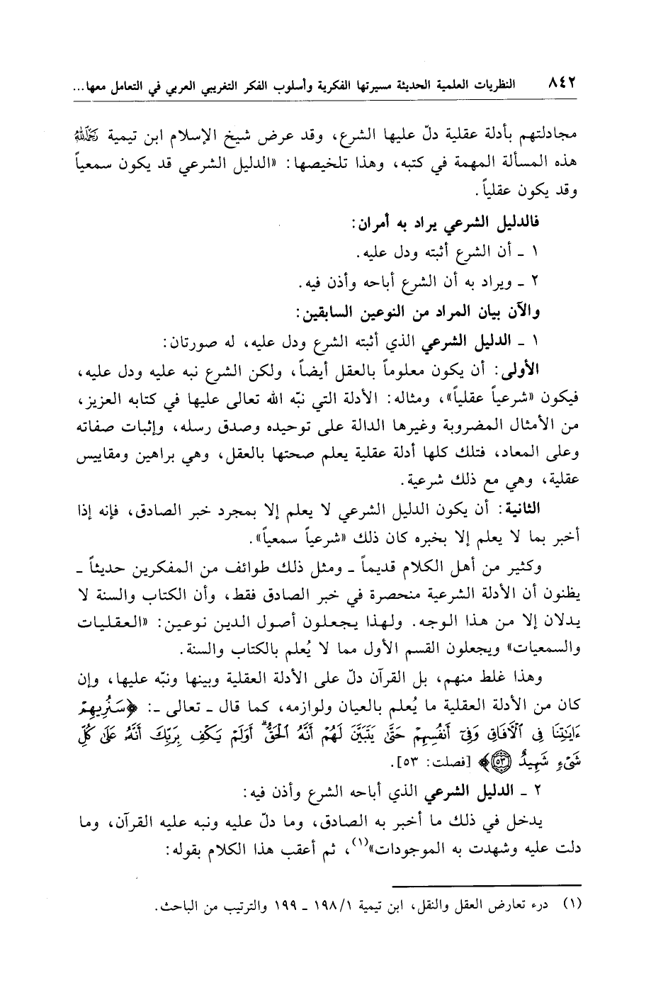 (¬1) درء تعارض العقل والنقل، ابن تيمية 1/ 198 - 199 والترتيب من الباحث.